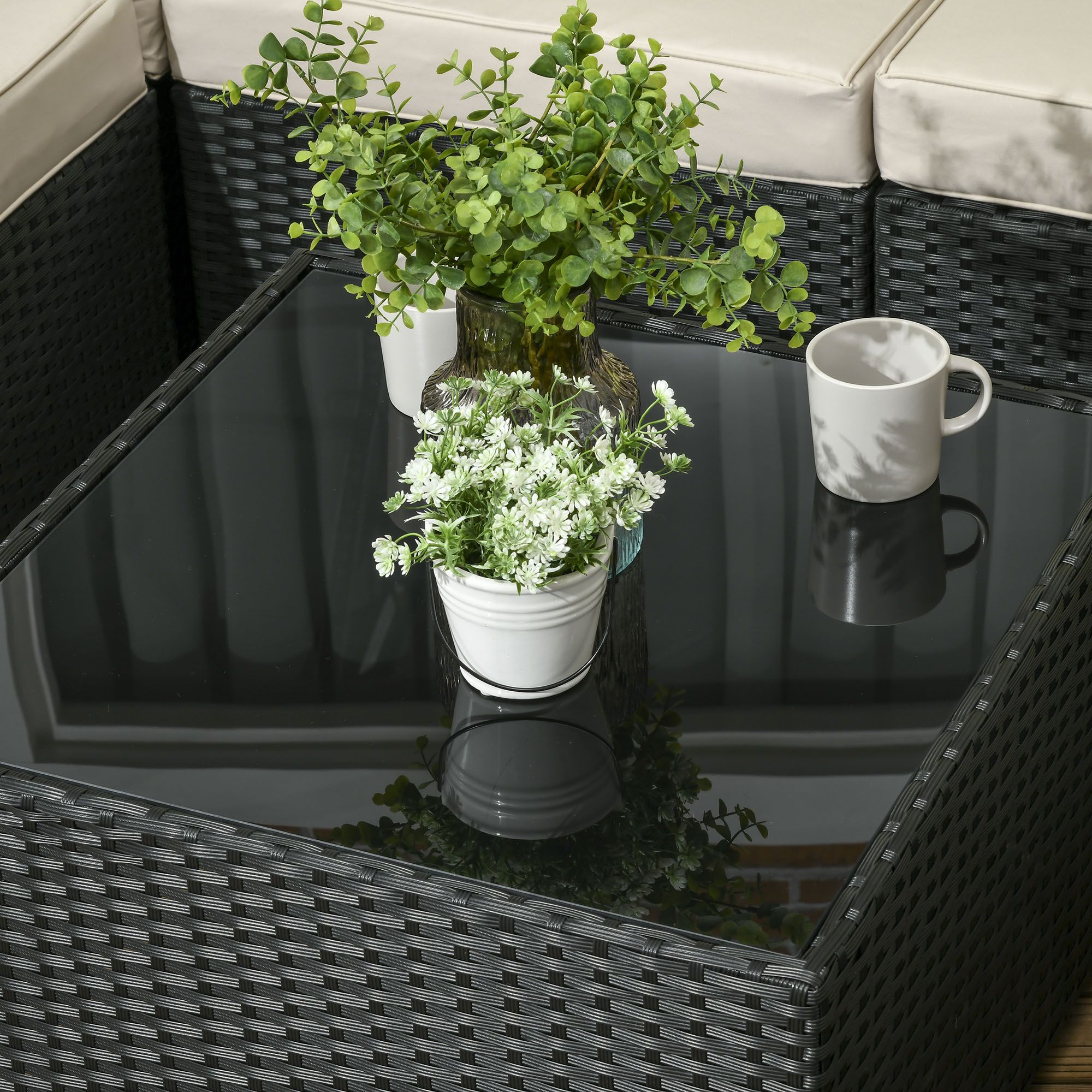 - Square glass top coffee table: A handy place to keep things near. Matches the rest of this rattan garden furniture set.