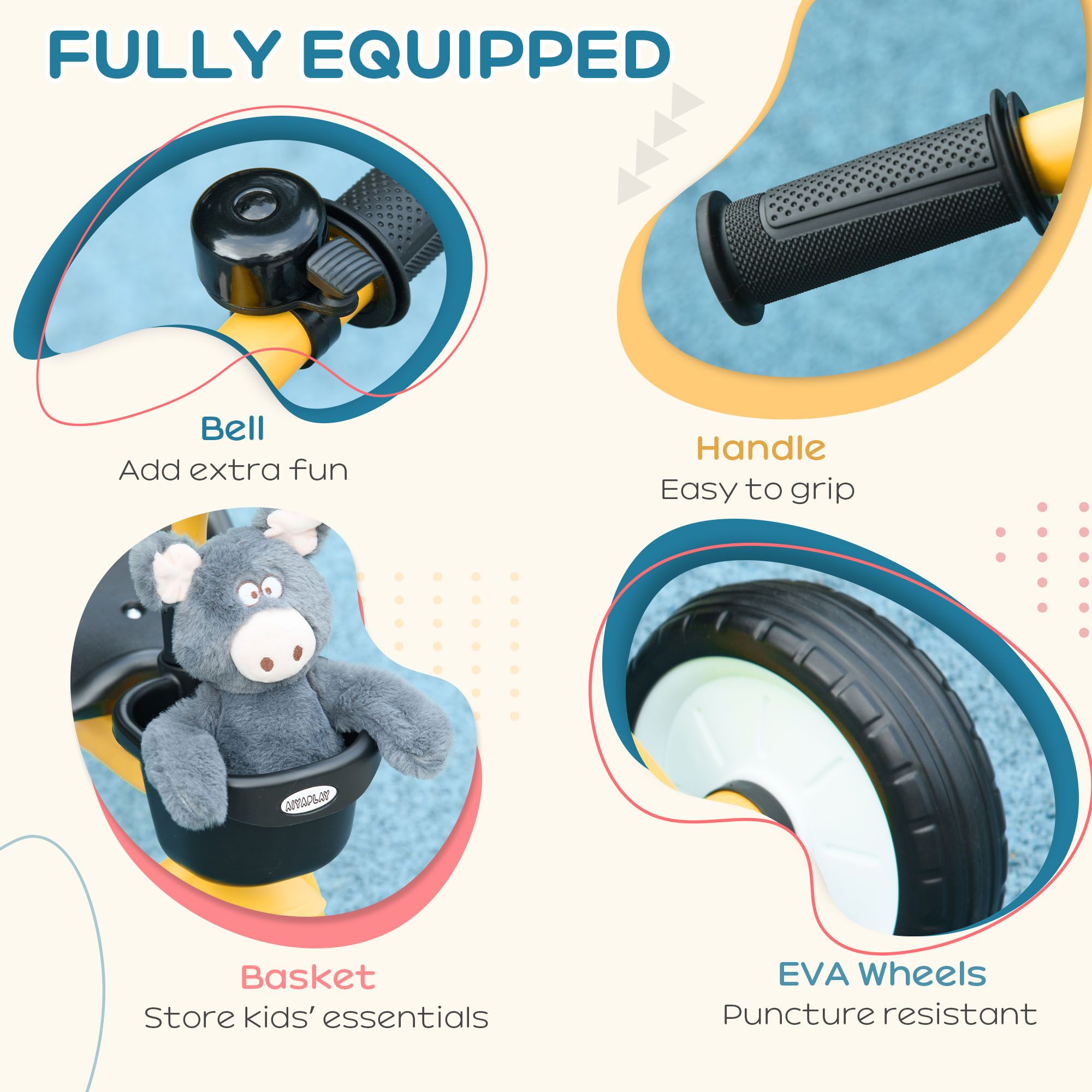 AIYAPLAY Kids Trike, Tricycle, with Adjustable Seat, Basket, Bell, for Ages 2-5 Years - Yellow