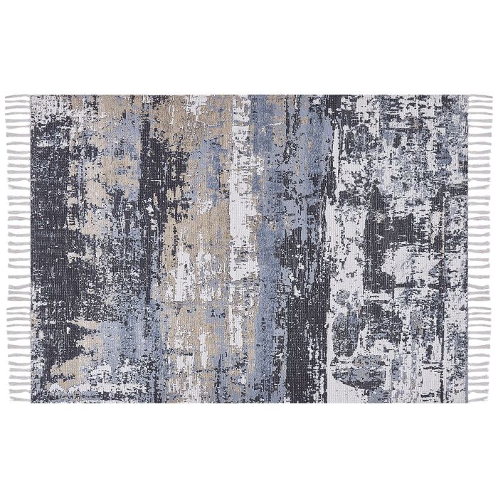This rug will make a gorgeous statement piece of any living area, whether modern or traditional in style. It features an abstract, geometric pattern in an eye-catching blend of colours and white tassels on both ends. Thanks to its unique design, it will fit well in a bedroom as well as in a hallway or a home office. If you’re looking for a rug that will suit your home décor, this one is the best choice. Details: Color: Multicolour, White, Black, Blue, Beige. Main material: Polyester. Additional material: Cotton. Material Composition: 10% Cotton, 90% Polyester Weight: 5.5 Assembly: Does Not Require Assembly