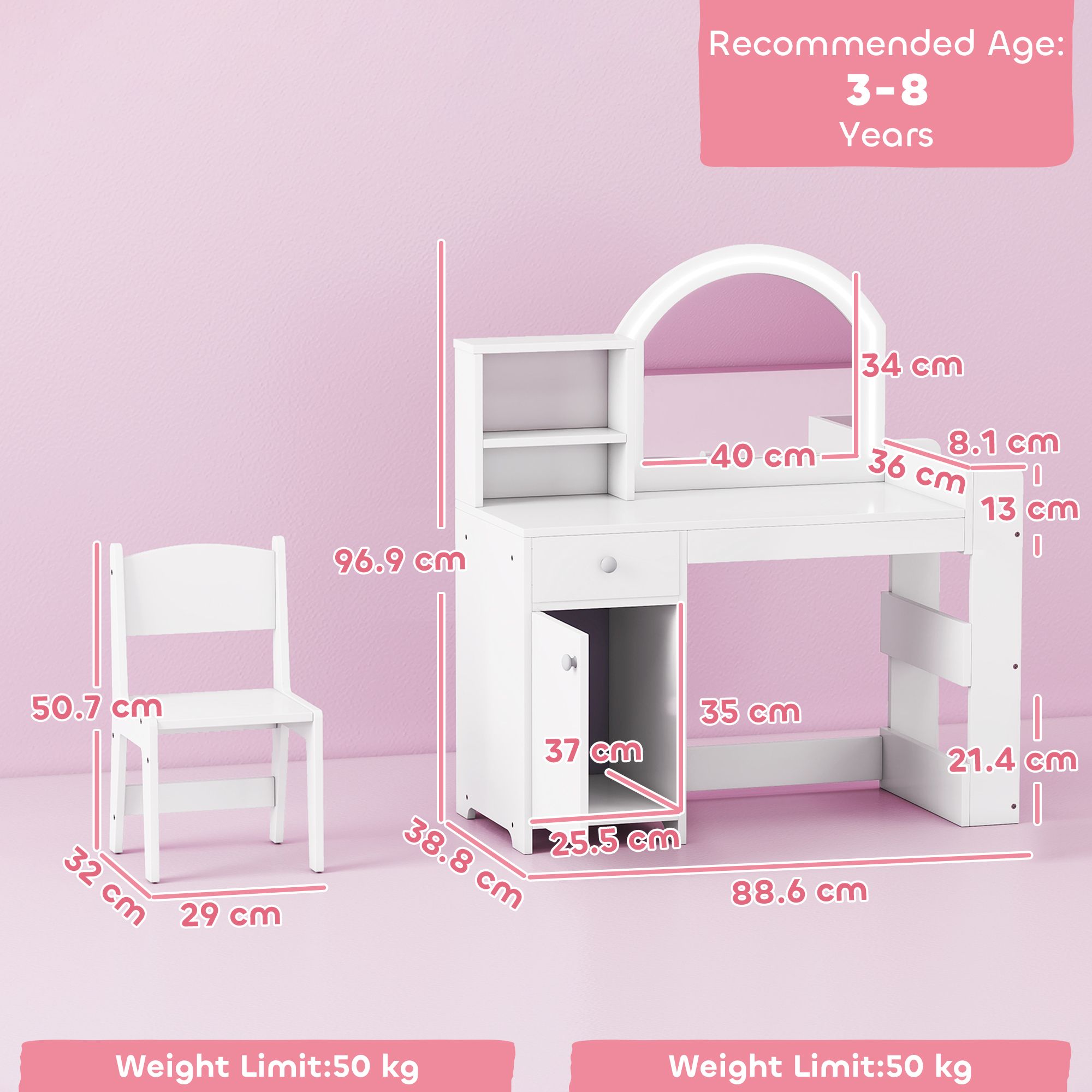 ARVION Vanity Table and Chair Wooden Dressing Table Set - White