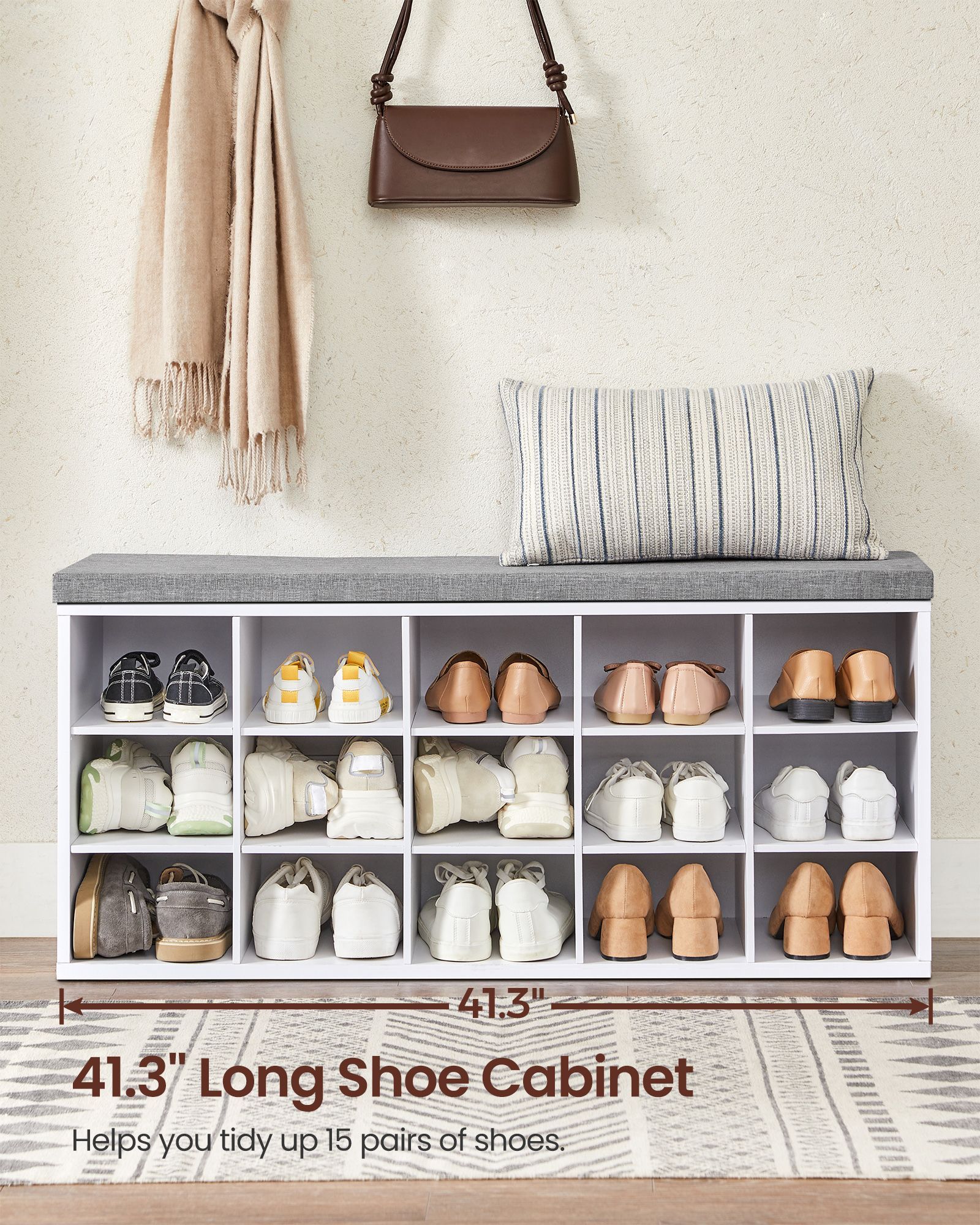 ASTSO Shoe Rack - 15 Compartment Padded Seat Medium Sized Rack - Dove Grey