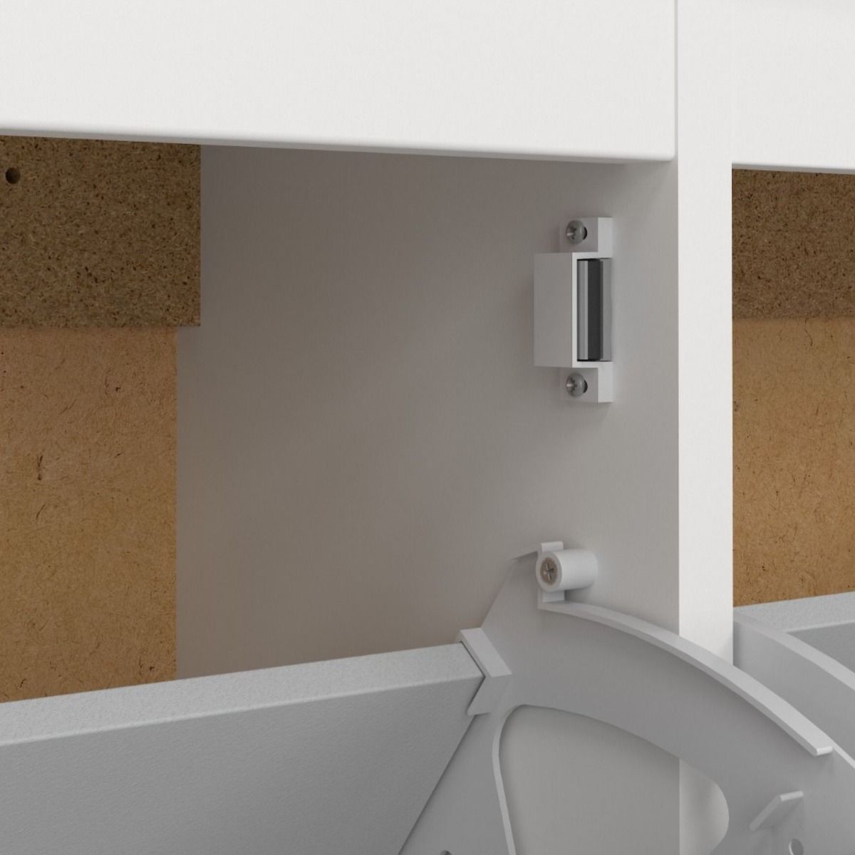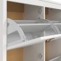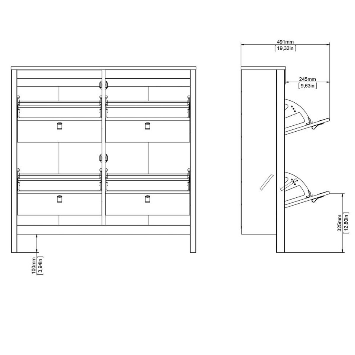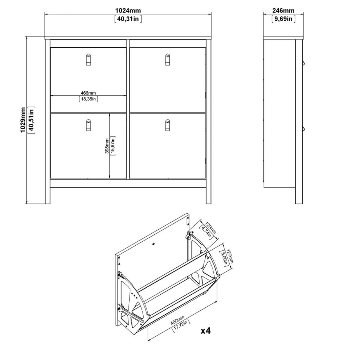 A modern shoe cabinet with four storage compartments in a striking design complete with brown leather tab handles, also available in contrasting matt black