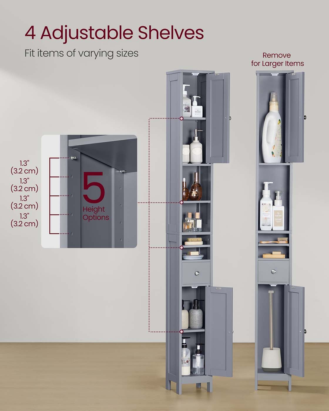 Bathroom Cabinet - ORATA Slim Freestanding Adjustable Shelves Drawer - Dove Grey