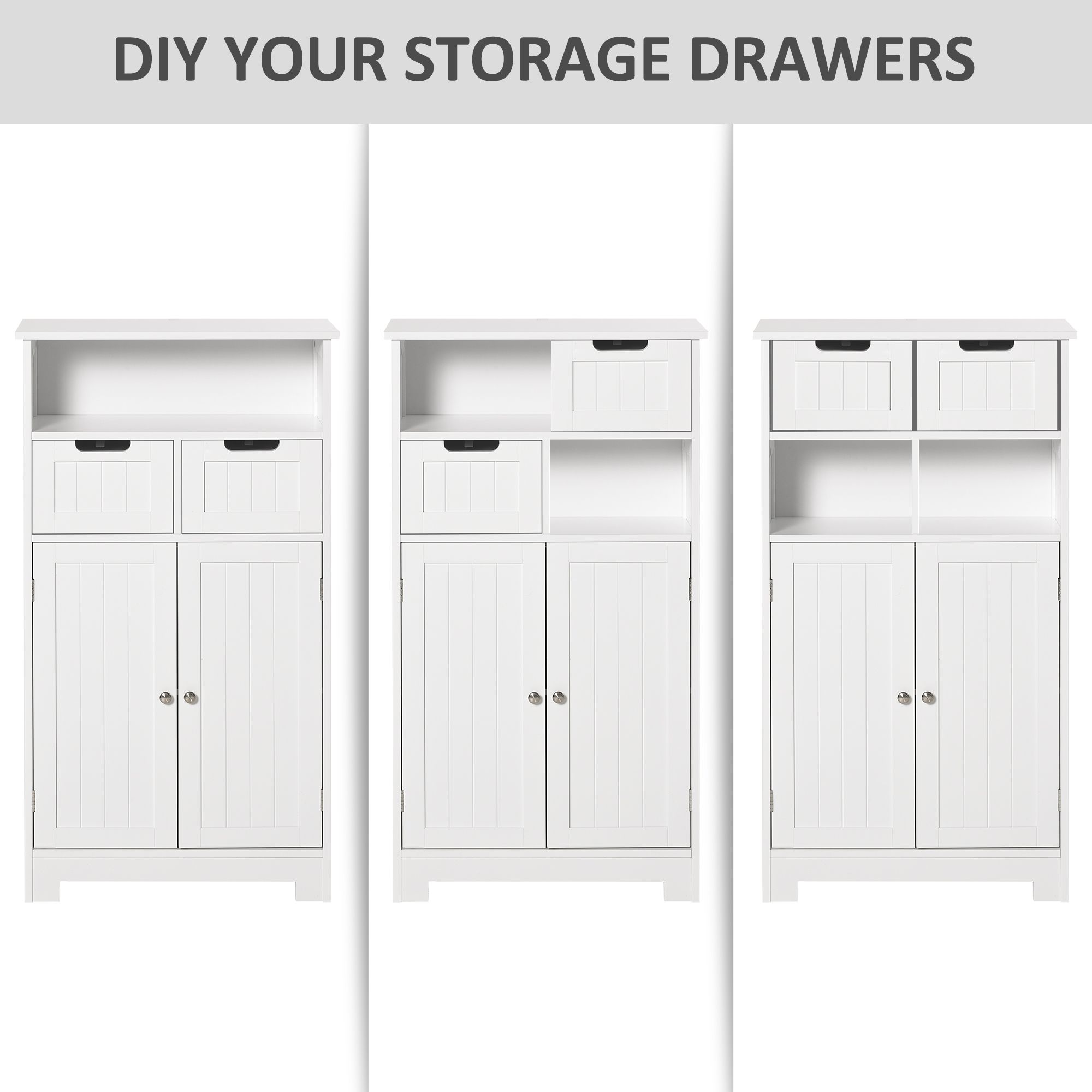 Expand the storage capacity in your bathroom with this cabinet from. Crafted of high quality MDF and delicate white paint finish that enhance the stability, this storage cabinet promises a long service life. Featuring open compartment, two drawers, one spacious cupboard with adjustable shelf, it can almost store all your bathroom essentials: soaps, towels, tissues, etc. It can be also used as a storage unit in entryway or bookcase in living room as you need.