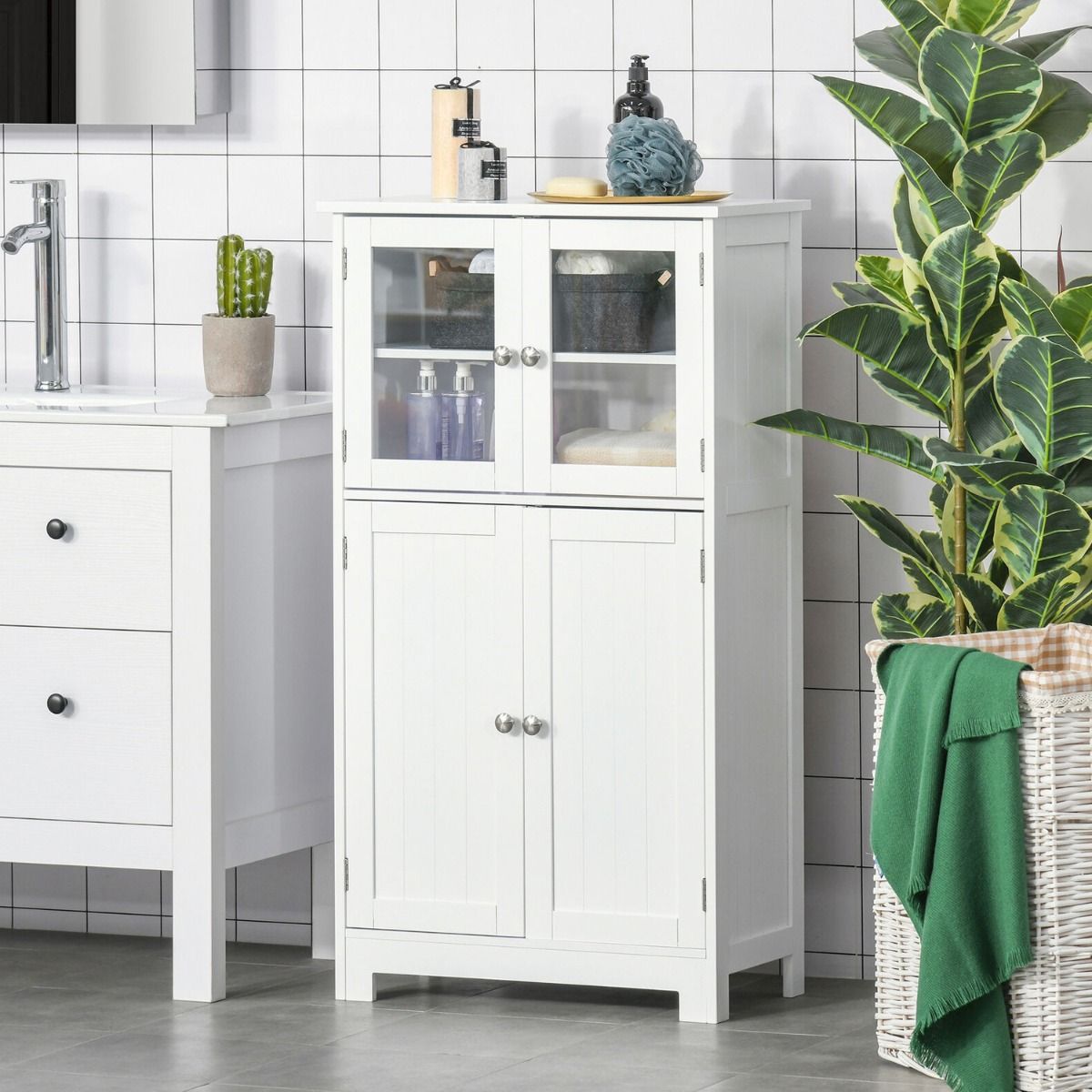 Features a concealed bottom storage space and a top area, which comes with two tempered glass doors to see inside easily. It's finished with a small base, elevating the bottom to help prevent water damage. A classic piece every bathroom requires.
