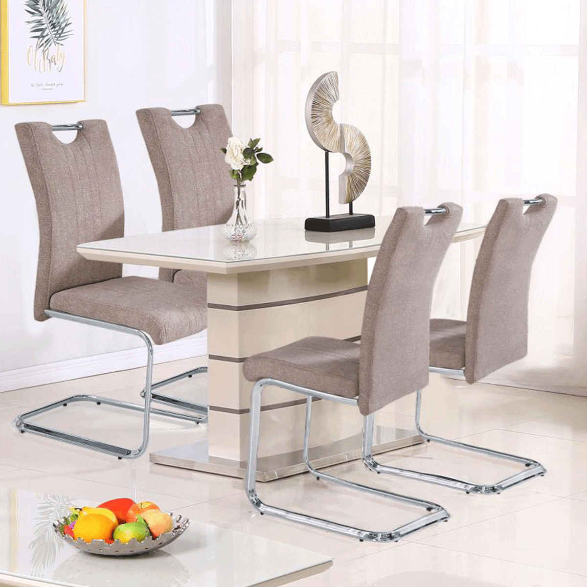 - Taupe Fabric: The chairs feature taupe fabric upholstery, adding a touch of warmth and elegance to your dining space.