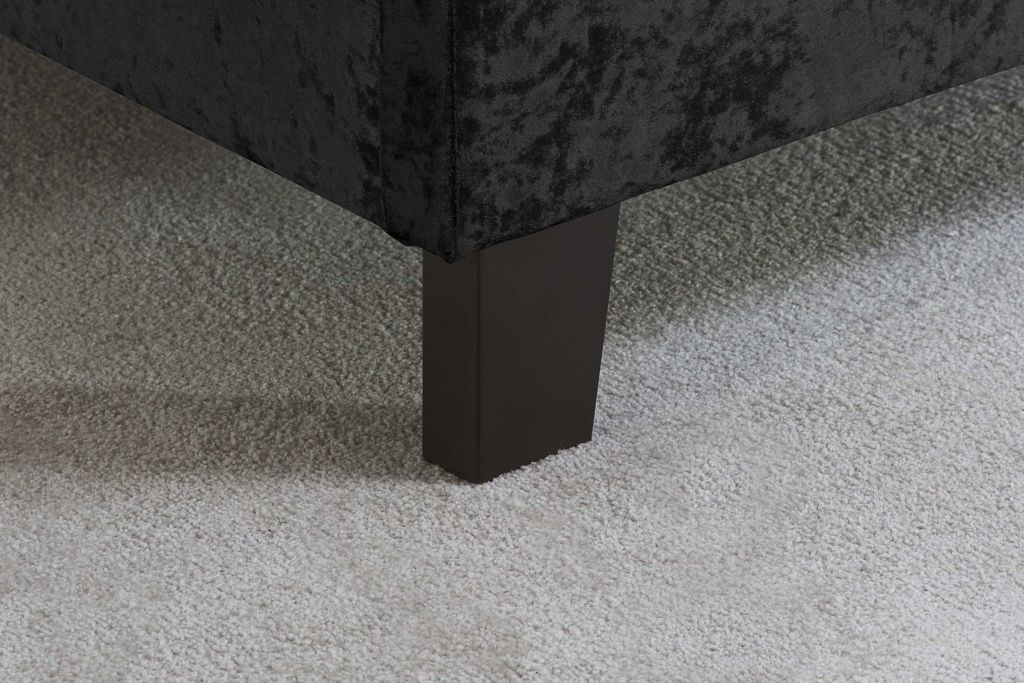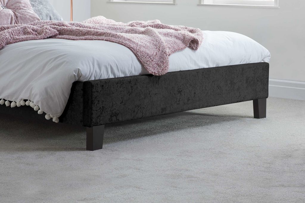 - This bed frame is upholstered in either grey fabric, steel or black crushed velvet.