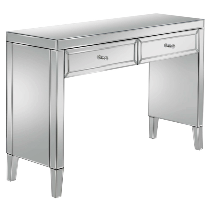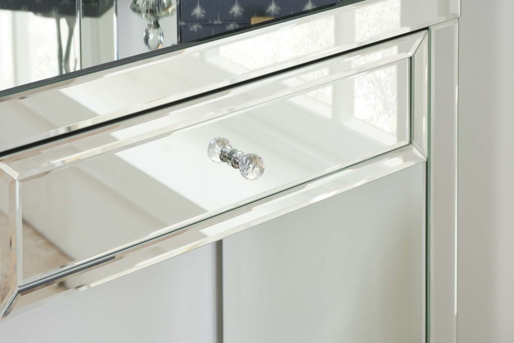 The beautiful and glamorous Valencia 2 drawer sideboard will be a stylish addition to any bedroom. Constructed from a MDF frame this stunning range features a mirrored finish with bevelled edges and elegant mock crystal handles. Cleaning and Care: Wipe with dry cloth