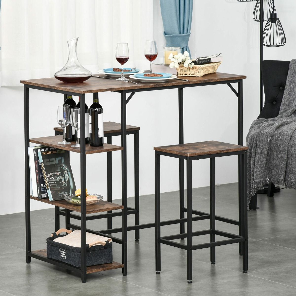Introduce style into your dining times with this three piece set. Focusing on an industrial design, the dark brown and black colourway is versatile so it works in plenty of differently-styled living spaces. The table comes with three side shelves to give you convenient and discreet storage.