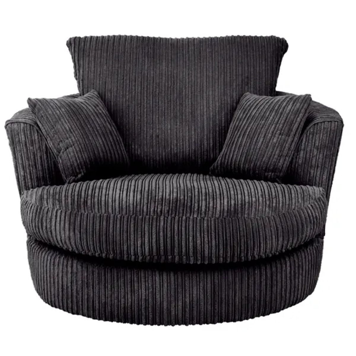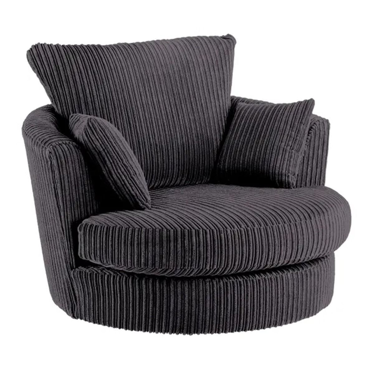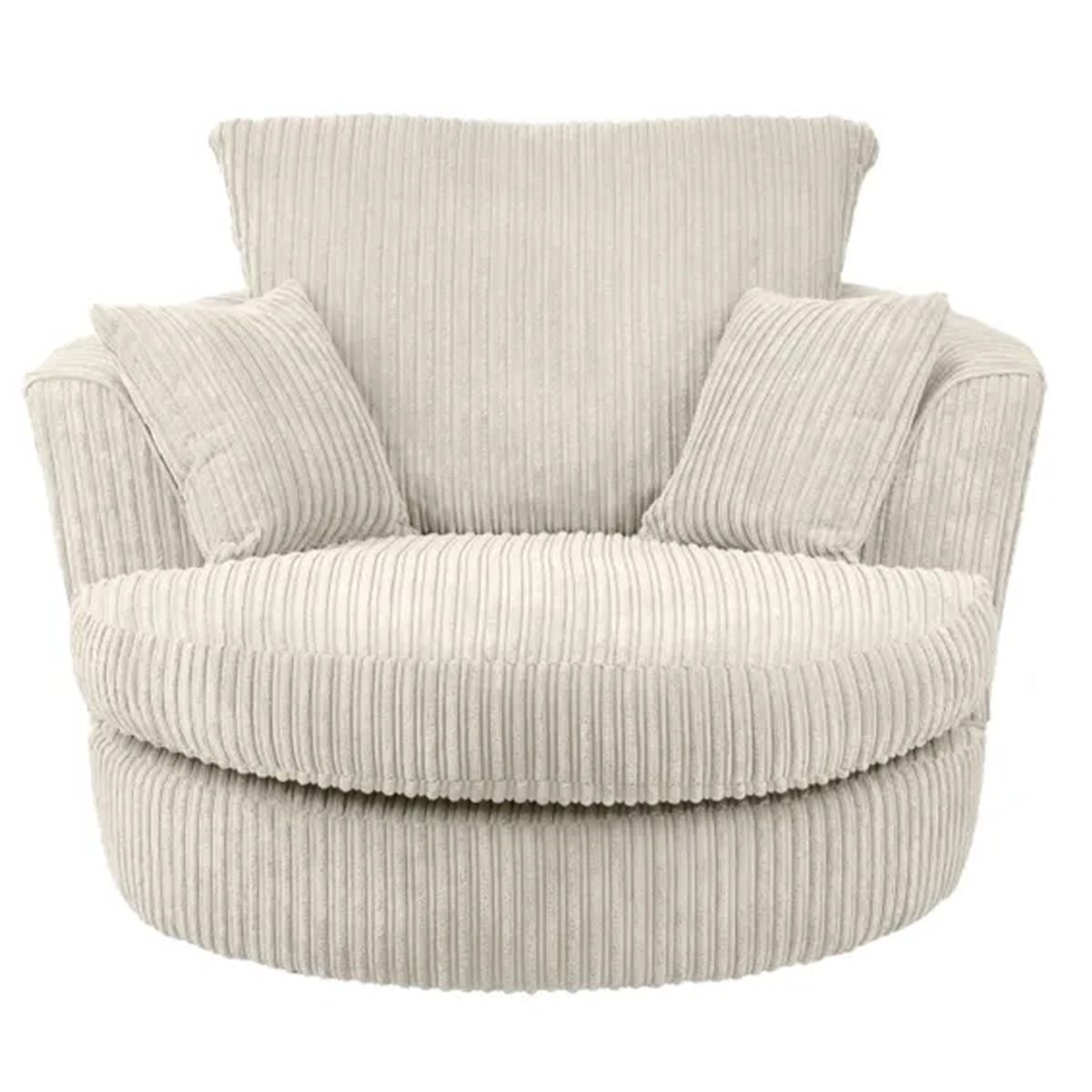 The Blake Jumbo Cord Swivel Chair features a modern style that will liven up any living space. Boasting a compact design perfect for any space both big and small, this chair provides luxurious comfort thanks to the foam and fibre filling of the deep set cushions and sprung seat which allows you to really sink in and unwind. This stylish and versatile chair also swivels on a sturdy metal base and is the perfect piece to suit a variety of home settings and styles. Upholstered in a soft and hard wearing jumbo cord fabric available in a choice of colours.