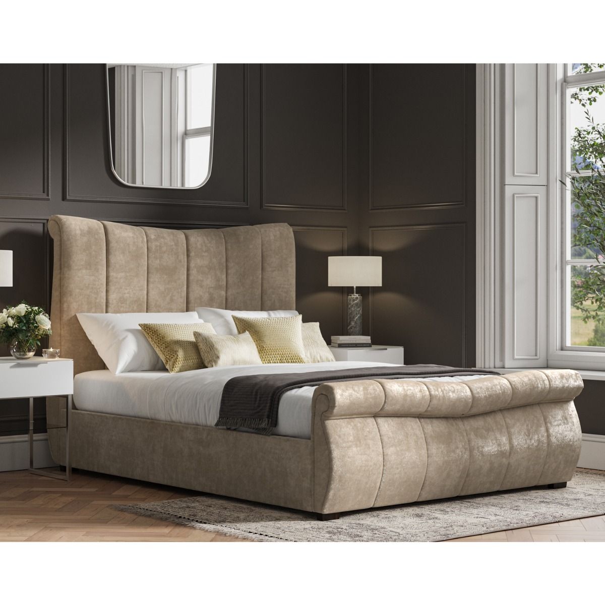 - Luxuriously high scrolled headboard and scrolled footboard design.