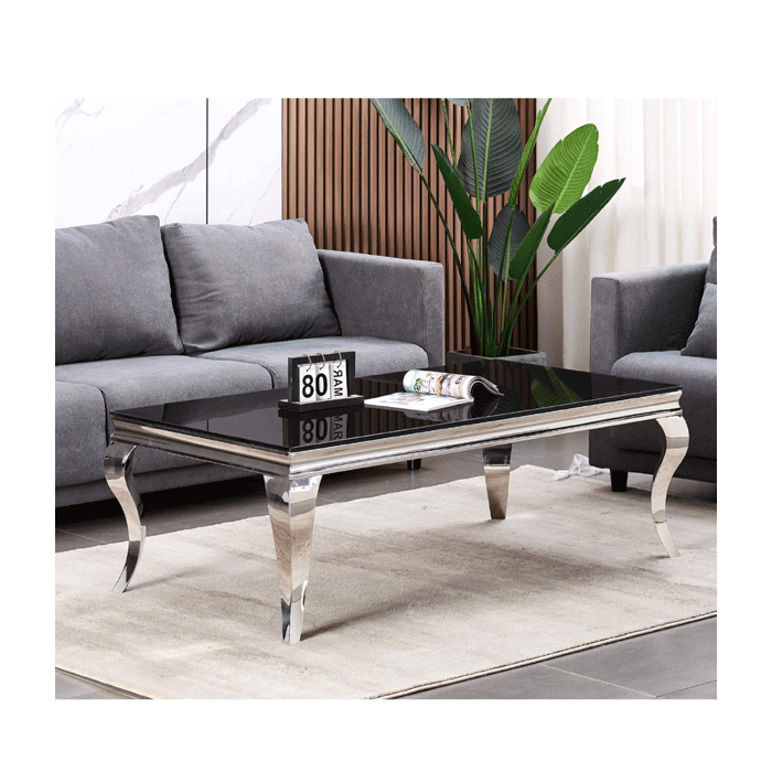 Brighton Stainless Steel Coffee Table with Black Glass Top in Silver Legs