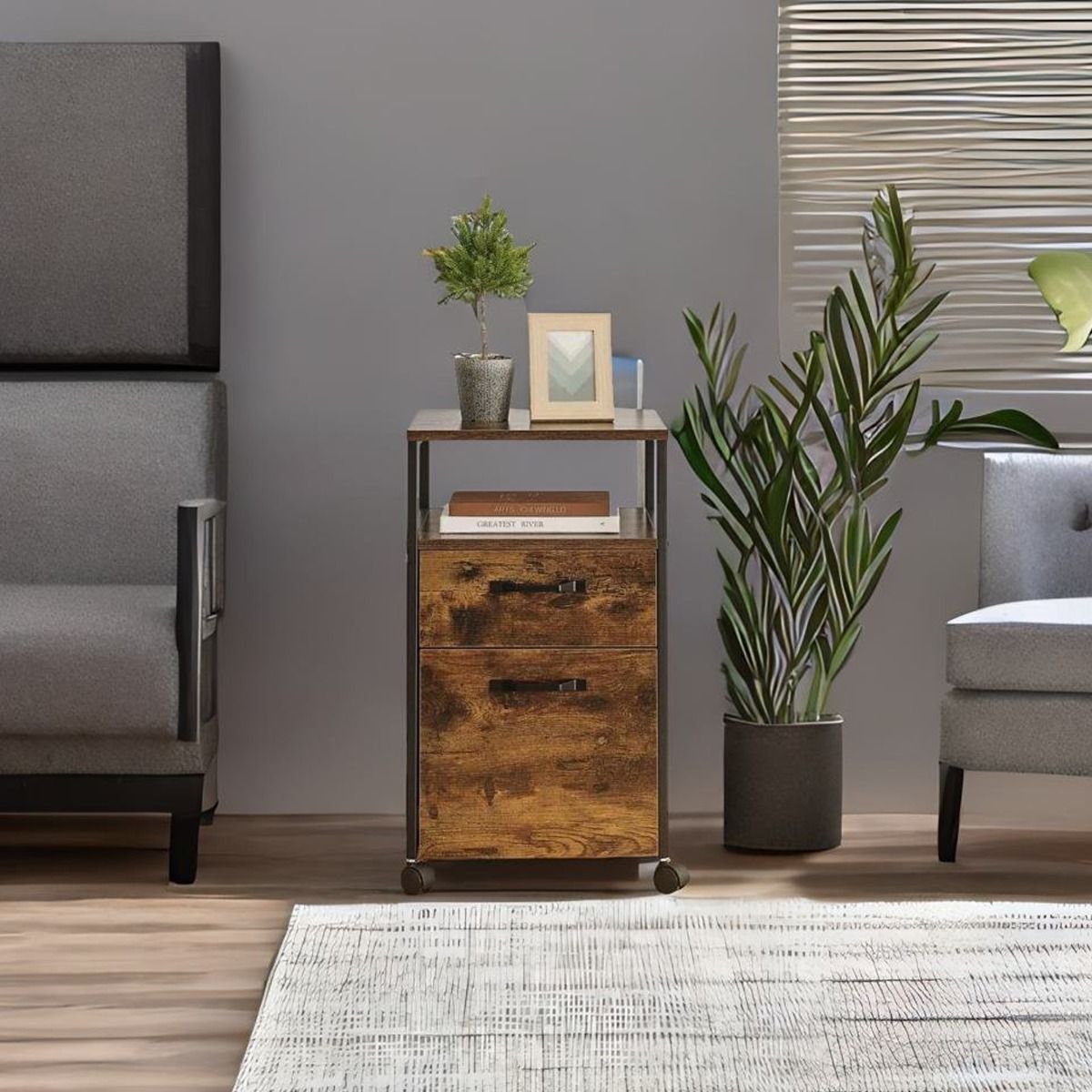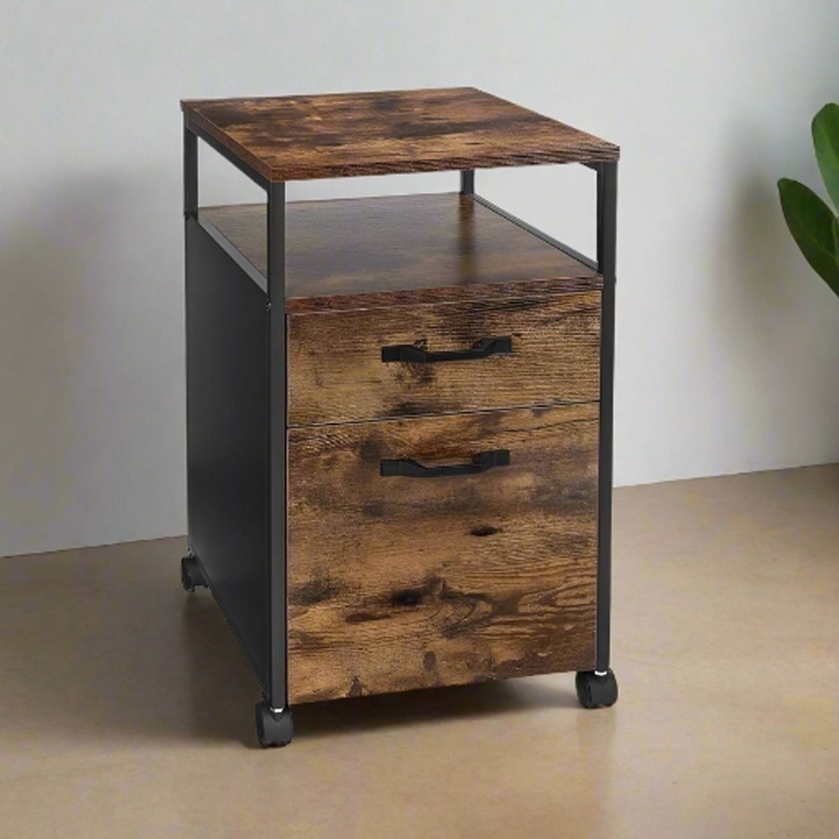CALIVERN Filing Cabinet Drawer Unit with Wheels - Rustic Brown and Black