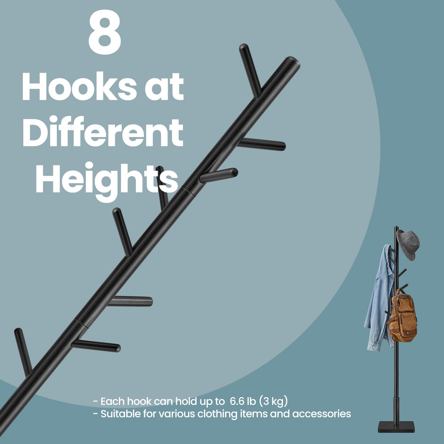 Coat Rack - ZARNIA Solid Wood Free Standing Hall Tree with 8 Hooks - Black