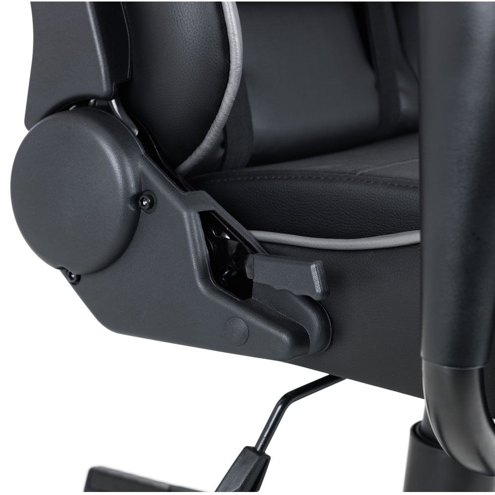 Get gaming with the Comet Gaming Chair. Upholstered in a modern black faux leather with grey accents, this gaming chair features a comfortable neck and lumbar support perfect for long hours of gaming or studying.