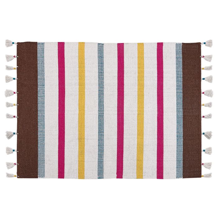 A colorful rug is always a good idea if you want to brighten up your interior and add an eye-catching accessory. This rug with its multicolor stripes and decorative tassels will match a variety of interiors as well as children’s room bringing in a positive vibe. Handwoven from high quality cotton, it will be appreciated by anyone who likes handmade accessories. Details: Color: Multicolour, White, Brown, Blue, Orange. Main material: Cotton. Material Composition: 100% Cotton Weight: 3 Assembly: Does Not Require Assembly