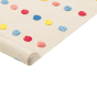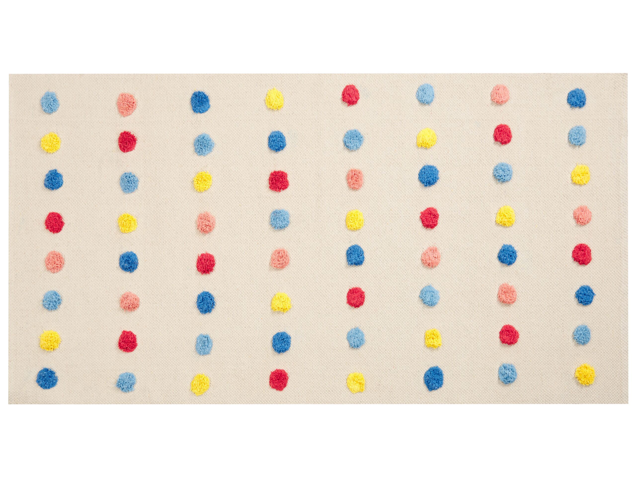 Add a touch of cheer to your child's room with this rug. Featuring multicolour mini pompoms, it will brighten up every area and ignite your little one imagination. Made from soft and durable cotton, it will provide a cosy and comfortable play surface for little ones. The anti-slip layer will ensure safety during playtime adventures. Details: Color: Multicolour, Beige, Blue, Yellow, Pink. Main material: Cotton. Additional material: Polyester. Material Composition: 95% Cotton, 5% Polyester Weight: 1.4