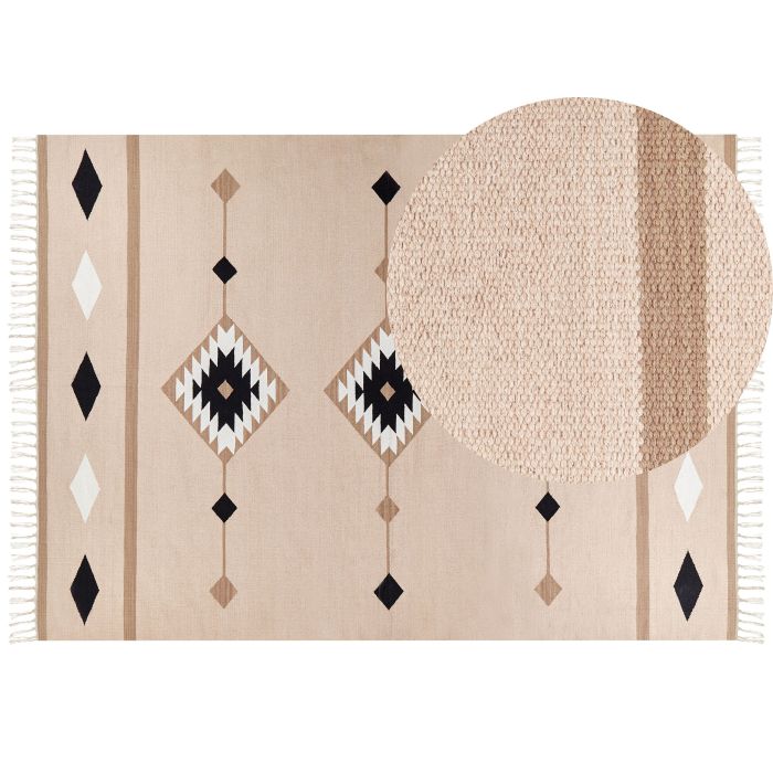 Indulge in the allure of our lovely reversible rug that will match any living room or bedroom in traditional style. It was meticulously handwoven from cotton, therefore it is comfortable, durable and easy in daily care. The piece features an intricate pattern that exudes timeless elegance and beige tassels that provide a graceful finish. Details: Color: Multicolour, Beige, Black, White. Main material: Cotton. Material Composition: 100% Cotton Weight: 7 Assembly: Does Not Require Assembly
