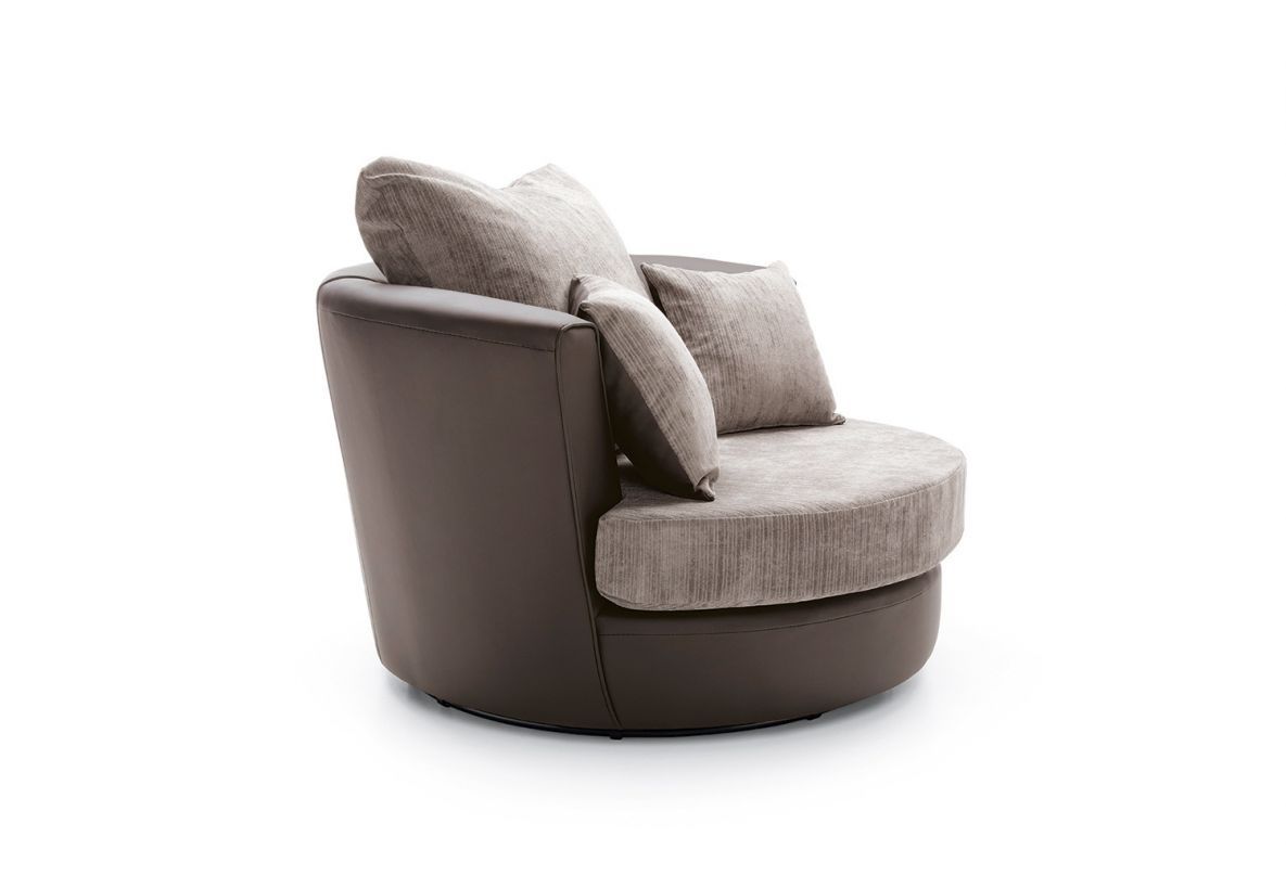 This Dilan swivel chair’s base is made out of solid wood, built for everyday use. Providing the cushioning are deep foam block seats and sumptuously fibre filled back cushions. High-back arm rests circle right back up to the shoulders. Also at your service are two toss pillows, included with the Dilan swivel chair. Upholstery is a combination cord chenille and faux leather fabric. Pick up the Dilan in a black/grey scheme or a livelier brown and beige colour pairing.