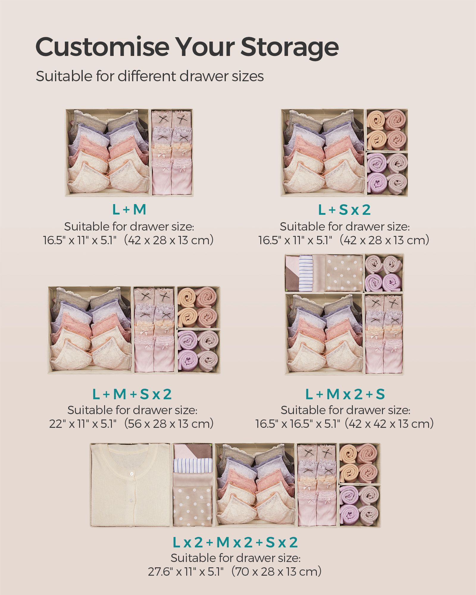 Drawer Organisers - AVOVA Foldable Fabric Set of 12 - Sand Beige