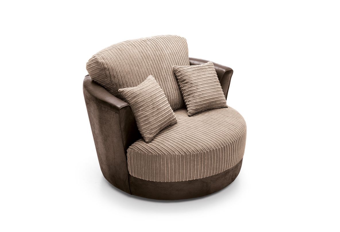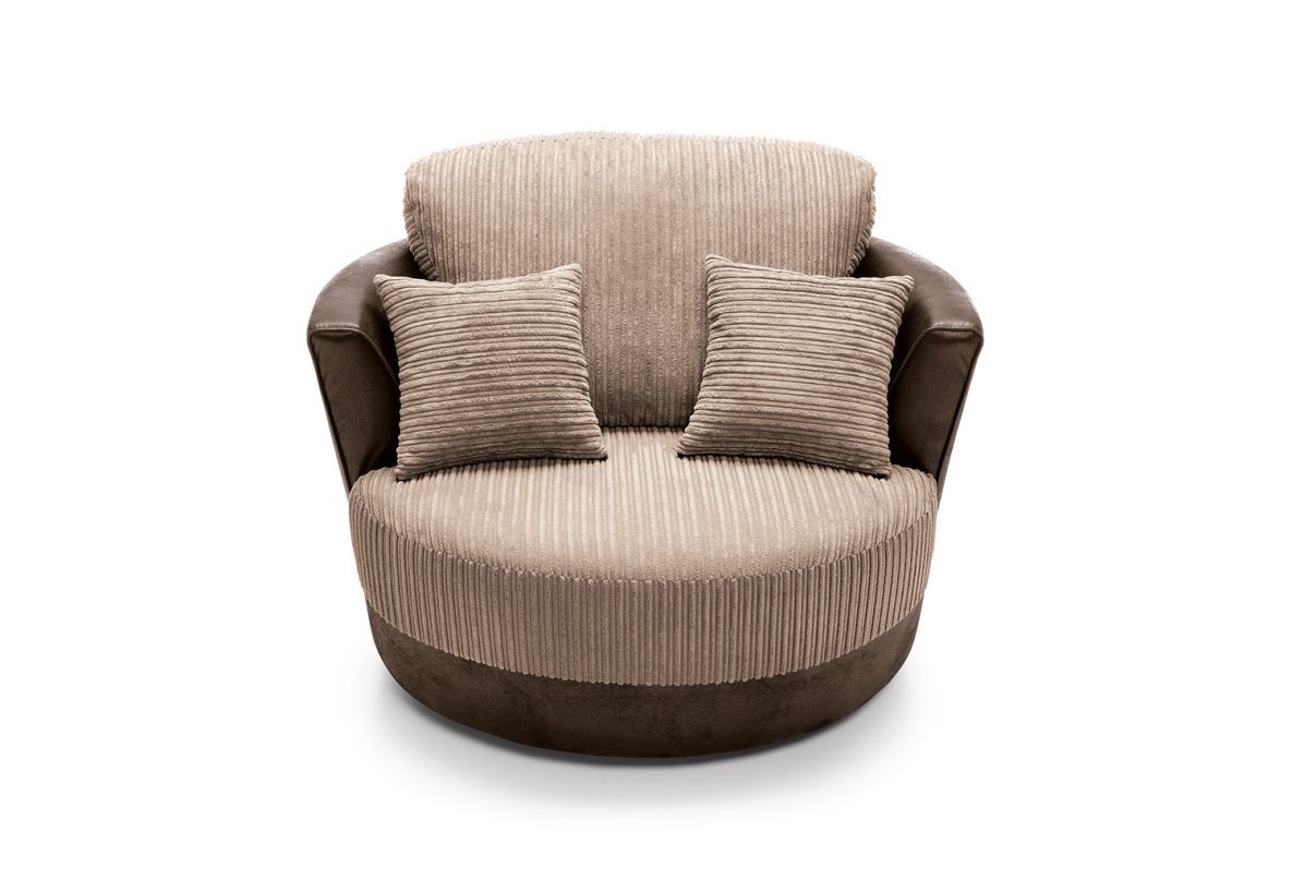 A lounge swivel chair that might just make others in the home envious! Enjoy high back cushions that can shelter even the broadest of shoulders, while offering ample arm rests as well. Deep-filled foam cushions are upholstered in a durable but exquisitely soft structured cord chenille and faux suede leather fabric. Enjoy a brilliantly comfortable chair that swivels with little effort. Colour options are a warm black and grey colour combination and also a more vibrant brown and beige colour combination.