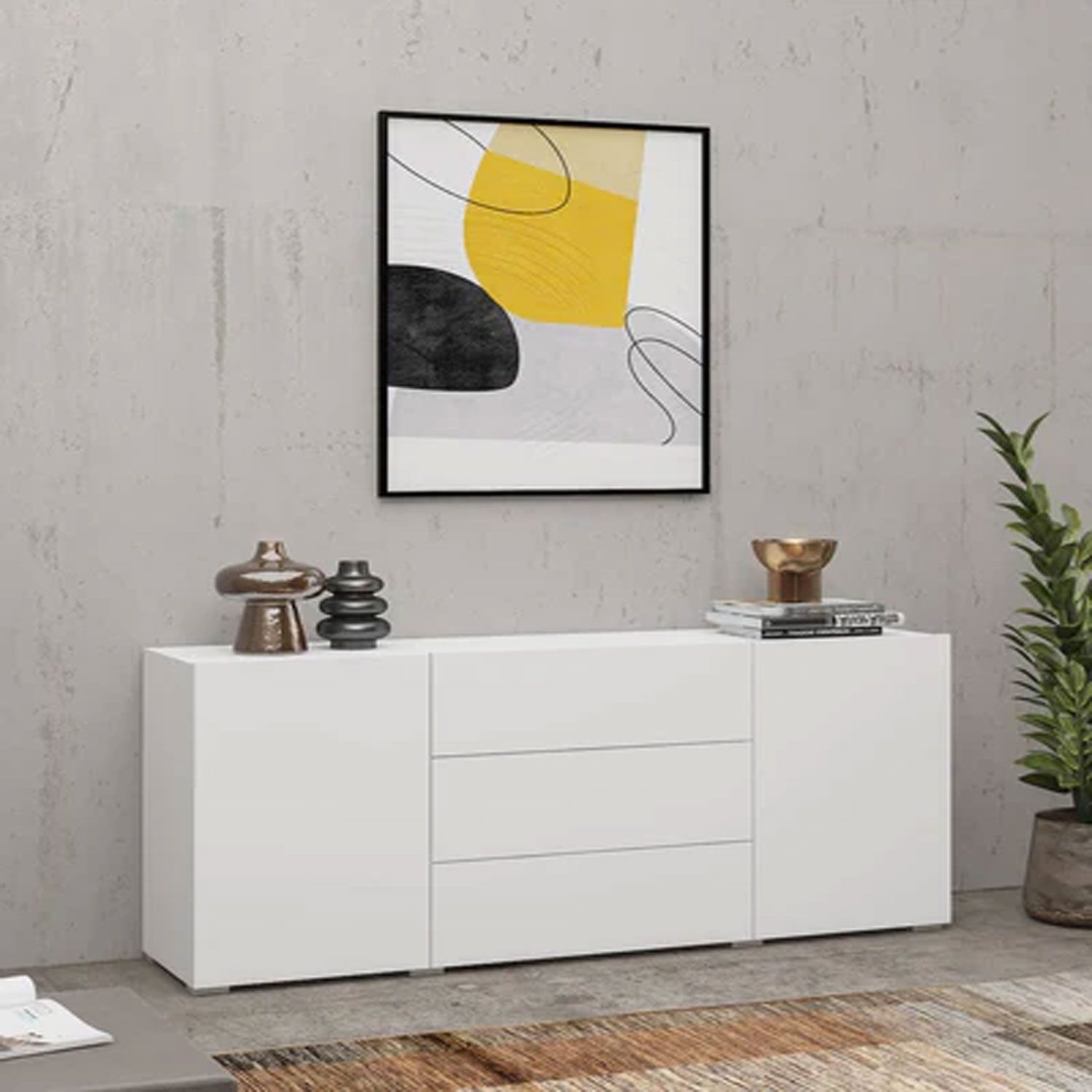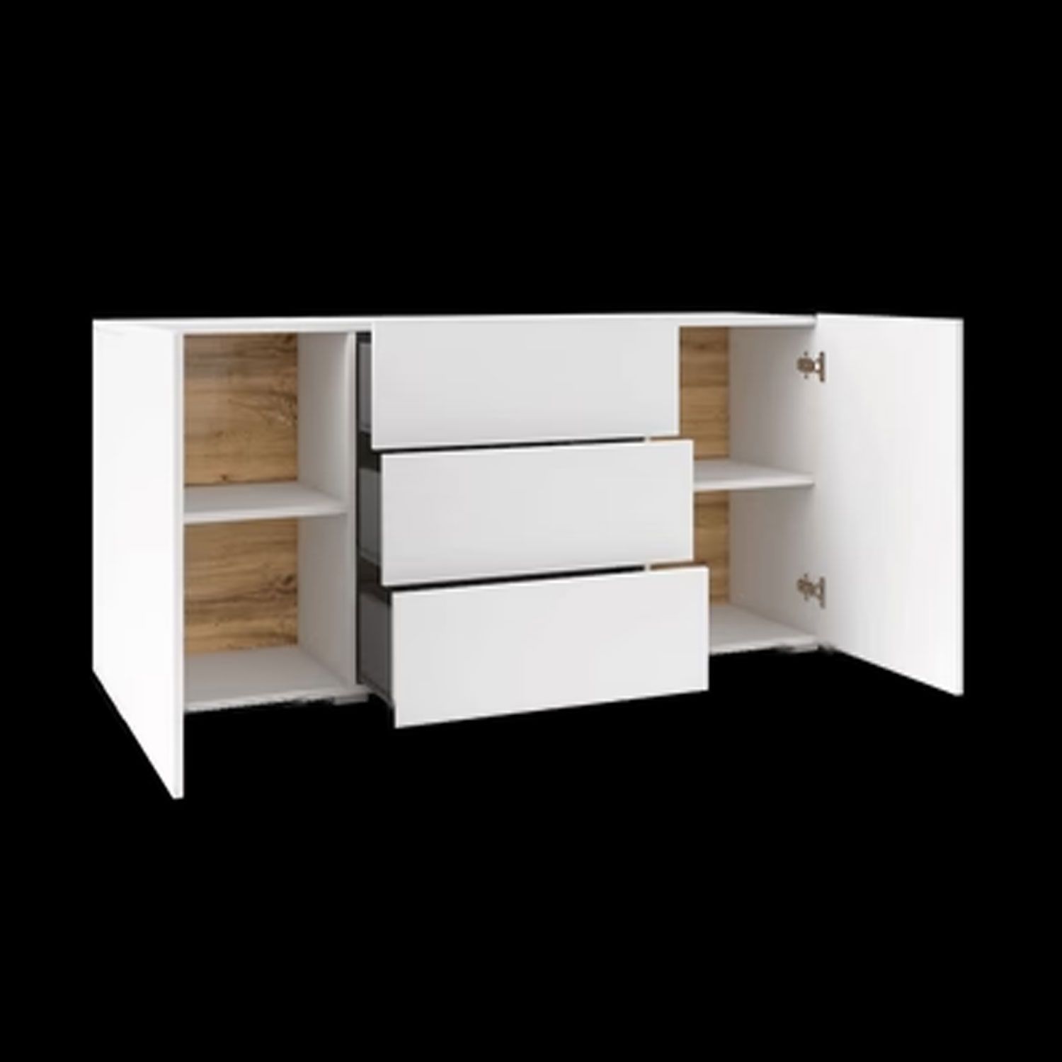 A stylish, functional and impeccably crafted sideboard cabinet that impresses with its high-quality craftsmanship and style. Allowing it to effortlessly blend in any modern or contemporary decor. It is made from 16mm laminated board, and offers three spacious drawers and four closed compartments for storage.