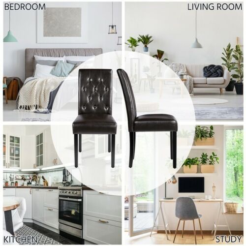 This dining chair is constructed with a solid wood frame, decent size seat, and tall backrest. Durable PVC leather seats filled with extra high-density foam and decorated with button tufting on the back. Simple style and elegant color perfectly fit your unique space and atmosphere.