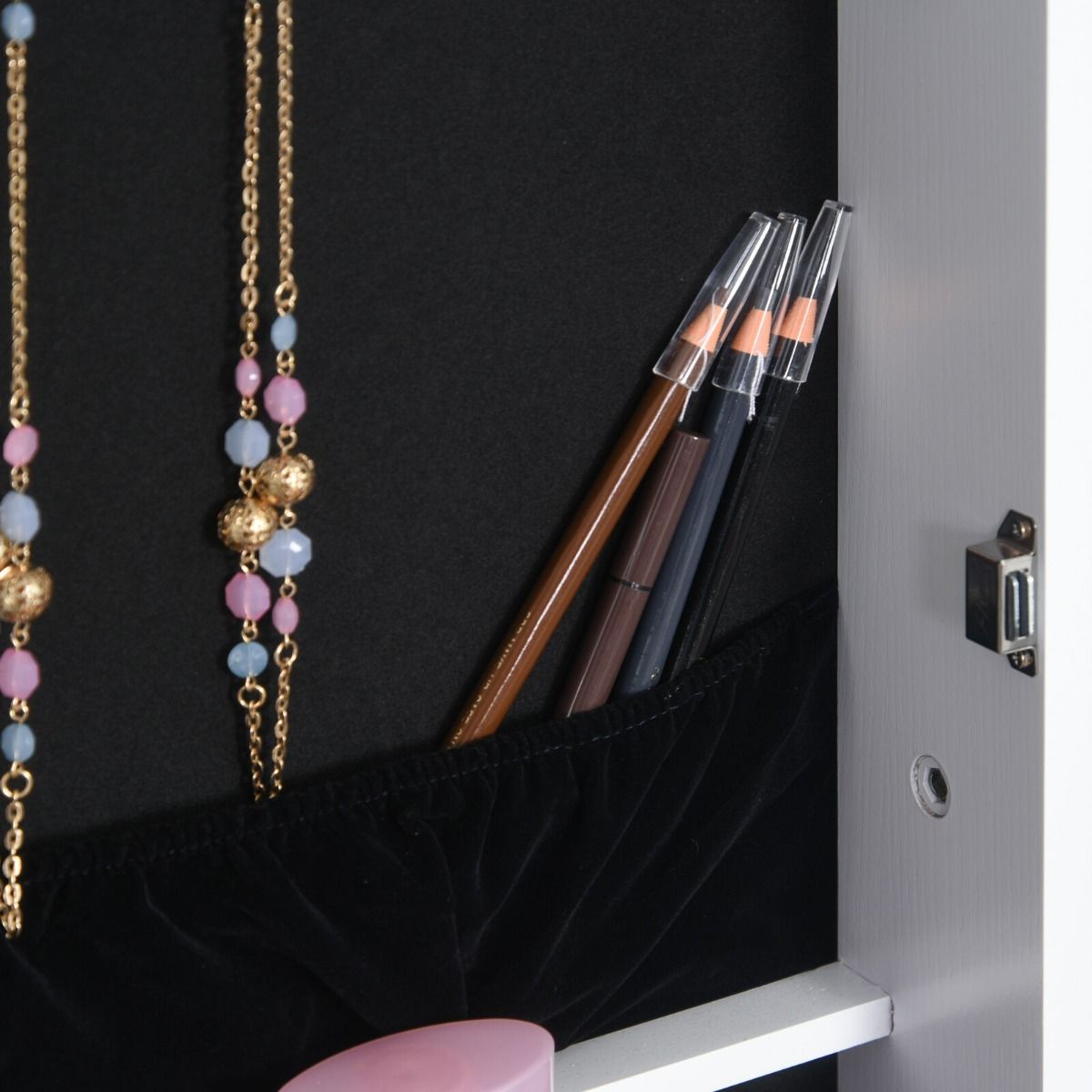 Keep all your jewellery safe, organised and easily accessible with this storage mirror armoire. On the outside, a full-length mirror is fitted for you to get easy, and can be adjusted to suit you. Inside features 114 earring slots, 18 necklace and bracelet hooks, 98 ring slots, fives shelves and a small bag so you can everything you need in one place.
