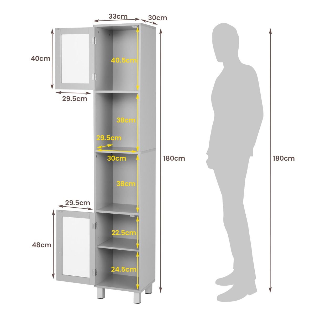 Freestanding Slim Wooden Bathroom Cabinet with Tempered Glass Doors-Grey