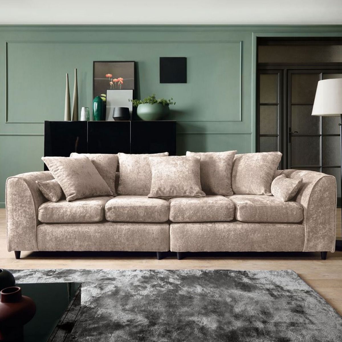 A fabulous 4 seater sofa upholstered in a sumptuous crushed chenille - a fuzzy cotton yarn of fabric that has pile protruding around the weave creating a caterpillar look. Stylishly contemporary with clean straight lines, this stunning sofa would be a great addition to any modern home. Bring a touch of glamour to your living room with the Gilliver collection. All sections in the modular Gilliver sofa series can be used freestanding or put together into exactly the combination you need.