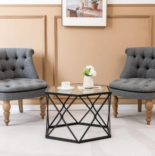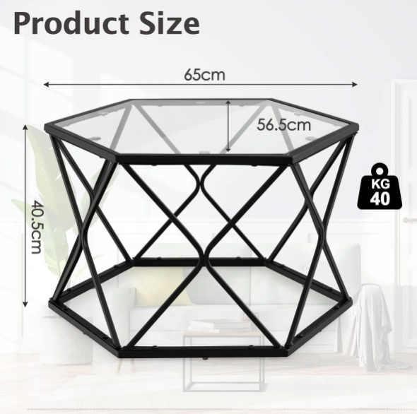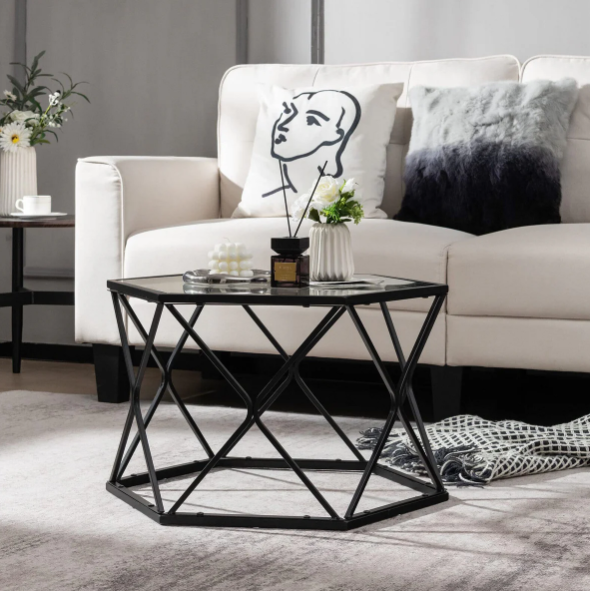 GLOWA Coffee Table - Hexagon Metal Frame Glass Top - Black