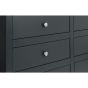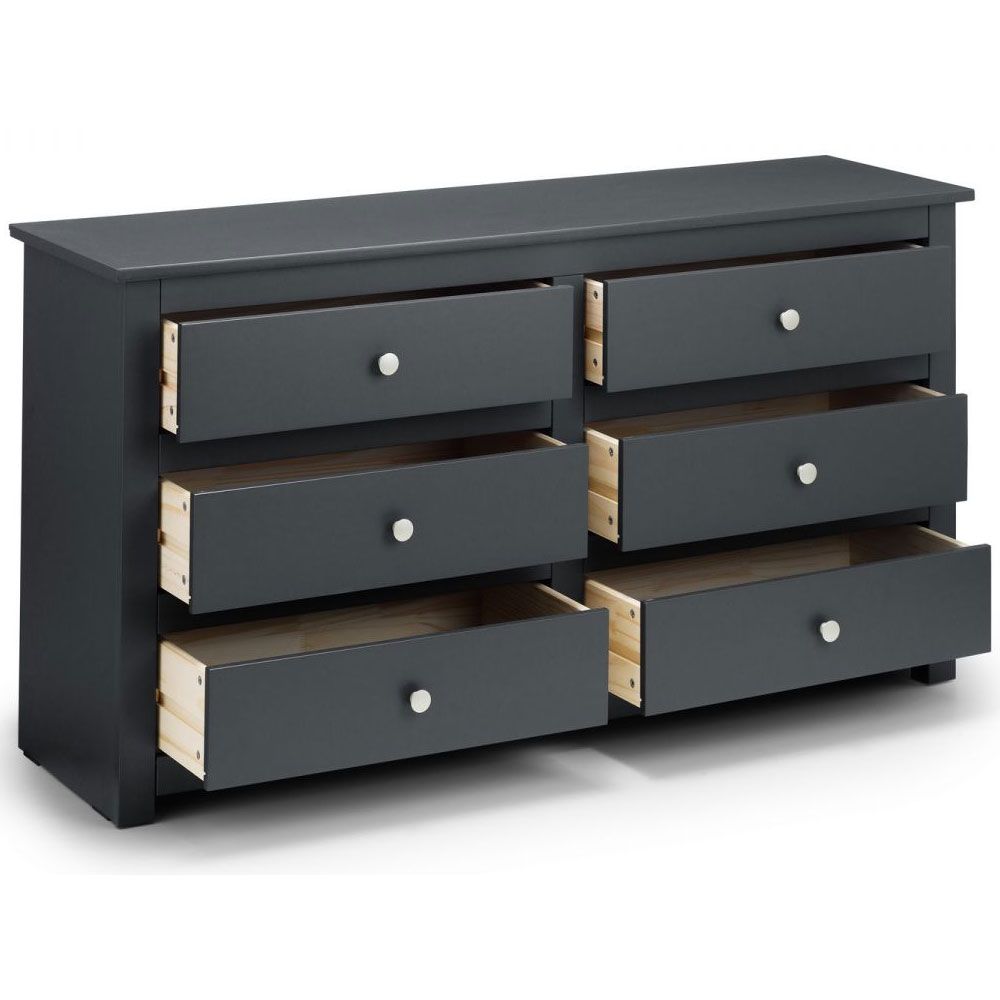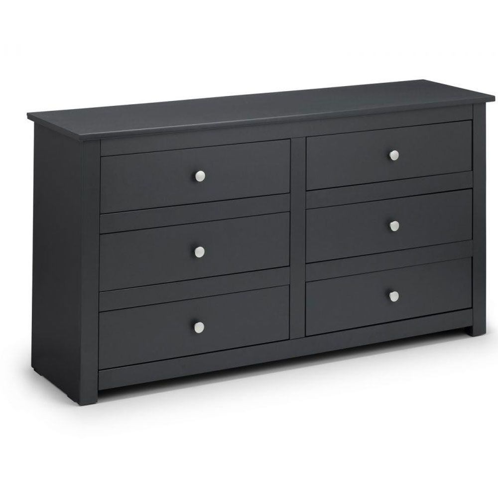 Boasting clean, simple lines the Radley 6 drawer chest is perfectly suited for both modern or traditional styles. Featuring six generously sized drawers, to keep your bedroom neat and tidy. Finished in an anthracite lacquer, with delicate silver handles.