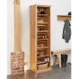Part of our innovative hallway storage range, this superb contemporary tall solid oak shoe cupboard offers invaluable hidden storage while serving as a beautiful piece of furniture. With seven shelves, including one removable for boot storage, it is designed to hold up to 16 pairs of shoes. Additionally, a handy wicker basket is supplied, sliding into the bottom section for added convenience. Crafted from the highest grade selected solid oak, it boasts exceptional build quality and features hardwood tongue and groove back for durability.