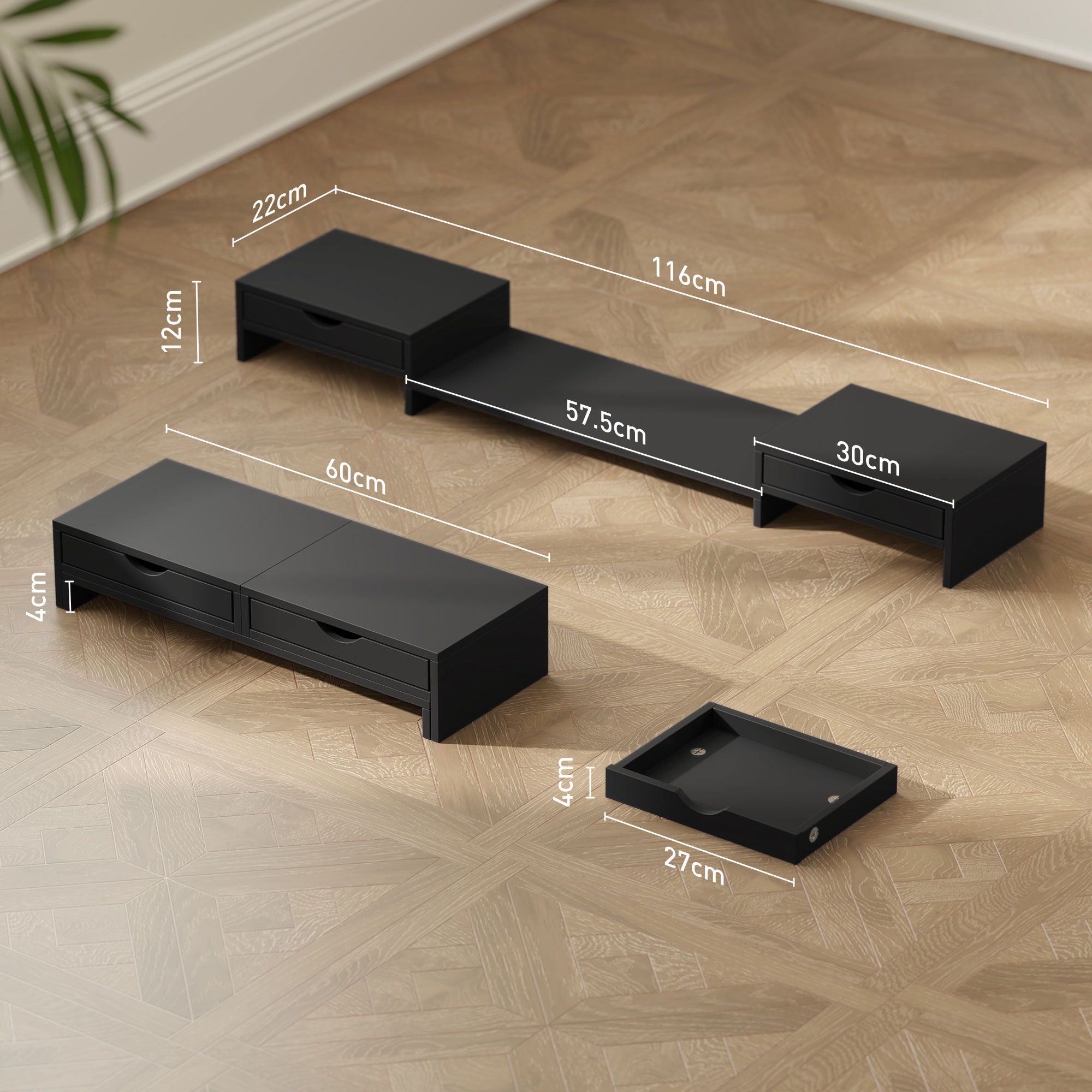 HERON Dual Monitor Stand Riser with 2 Drawers, Adjustable Length and Angle, 116cm Monitor Riser for Laptop, Computer, PC, Small Printer, Black