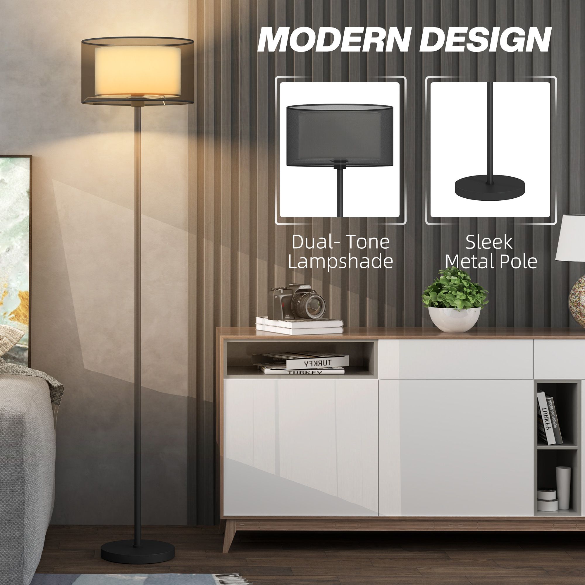 HERON Floor Lamp Modern Standing Lamp with Double Layer Shade Black