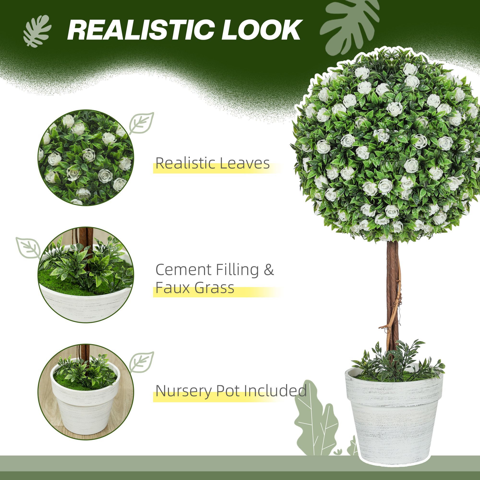 HERON Set of 2 Decorative Artificial Plants, Ball Topiary Tree with Rose Flower in Pot, Fake Plants for Home Indoor Outdoor Decor, 60cm, White