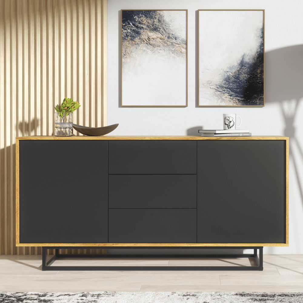 Industrial Loft Sideboard Vintage Oak Retro Cabinet with Drawers - Oak and Black