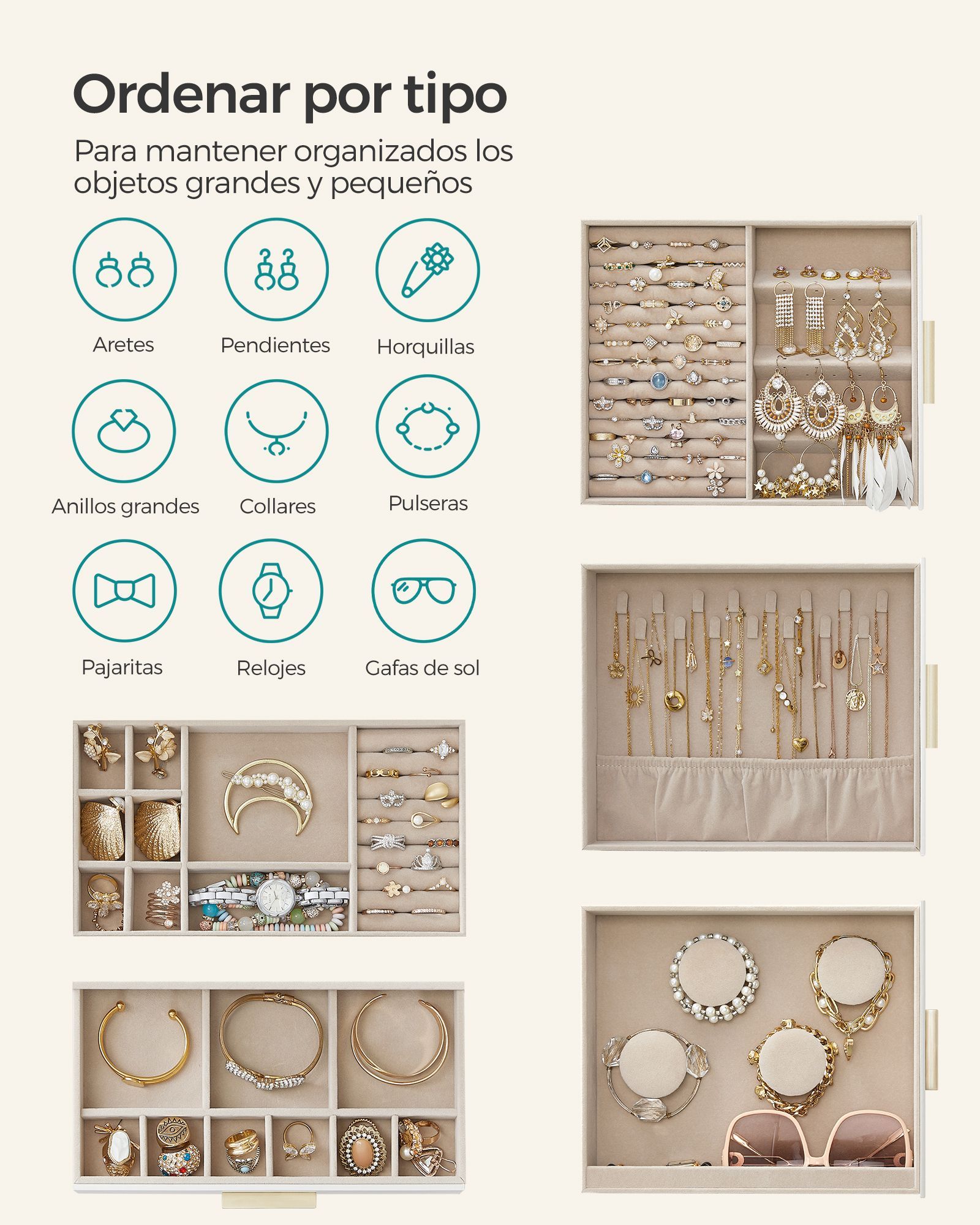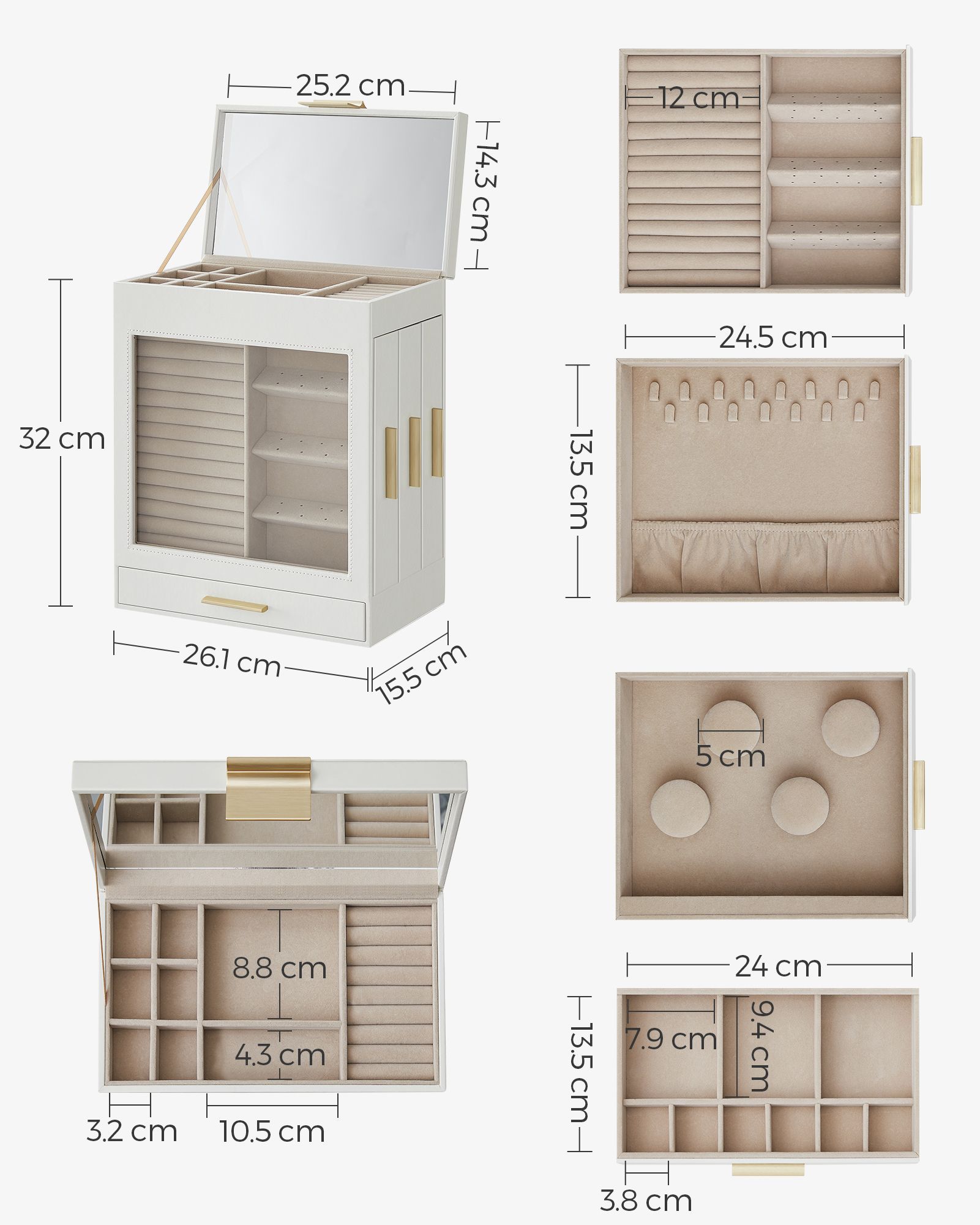 Jewellery Box with Glass Window, 5-Layer Jewellery Organiser with 3 Side Drawers, Jewellery Storage, with Vertical Storage Space, Big Mirror, Modern Style, Cloud White JBC162W01