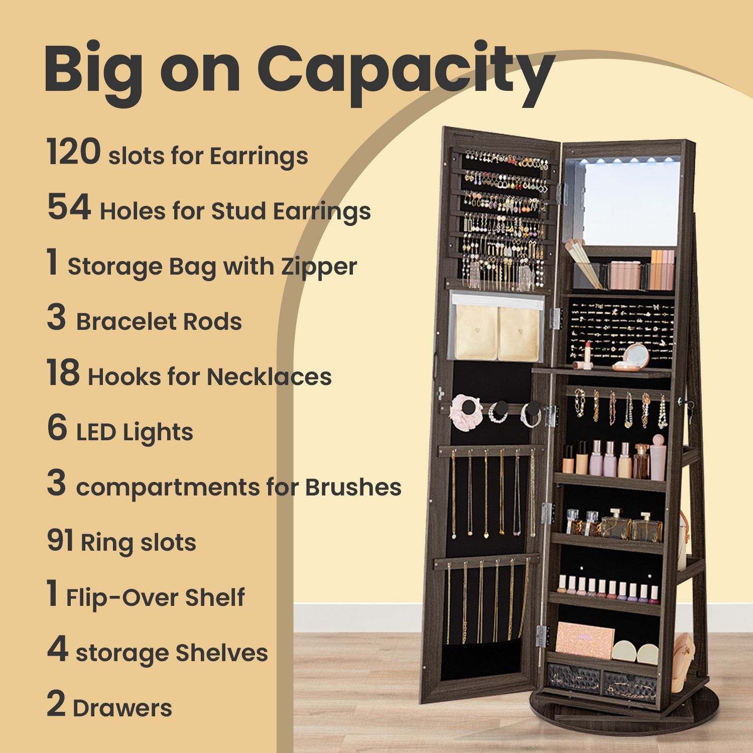 Jewellery Cabinet - VERRIA Swivel Lockable Mirror Organizer Frameless Full Length - Ash Brown