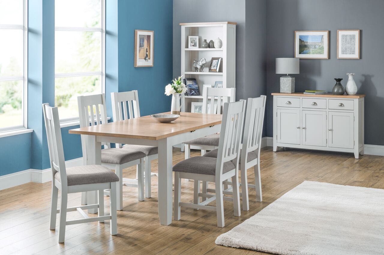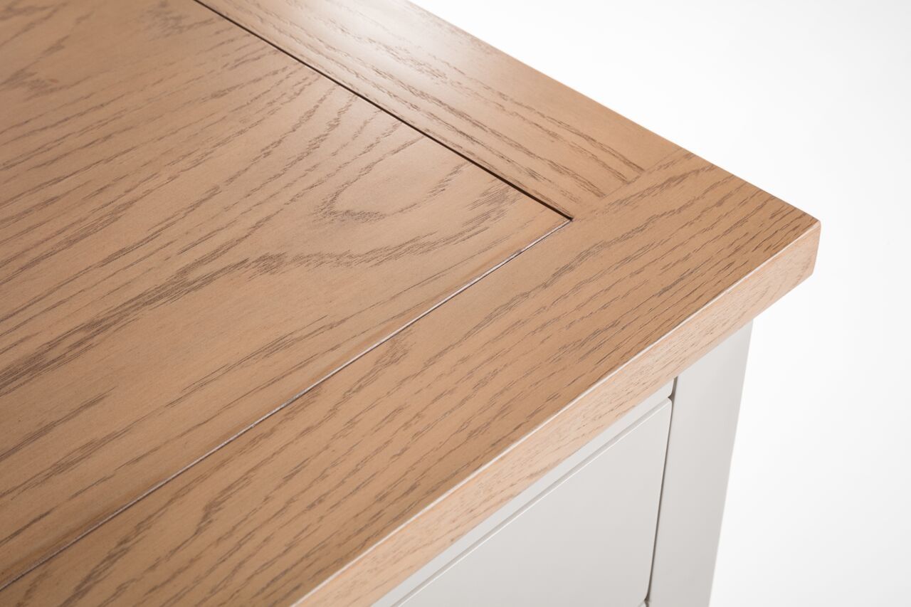 An elegant Sideboard, presented in an immaculate painted, soft Elephant Grey finish with beautiful pale oak top, crafted from a combination of high grade American White Oak solids and veneers. This stylish piece looks beautiful and offers phenomenal storage for kitchen, living or dining room. Includes three practical drawers above a double and single cupboard space, accented with chic cupped handles in a brushed steel finish; ideal for cutlery , crockery and glassware. The combination of superior quality materials and classic design ensures a timeless appeal and fits perfectly alongside both traditional and contemporary decor. Part of the extensive Richmond Dining and Occasional furniture range.