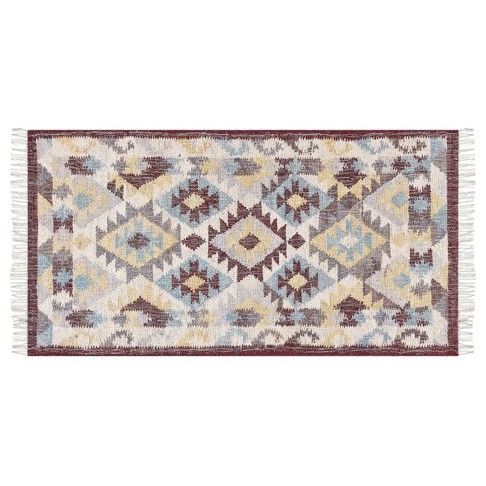 Introduce a cosy and warm accent to your living room or bedroom with this accessory. It was handwoven from the blend of jute and cotton, therefore durable and superbly easy to maintain. The carpet features a geometric pattern and tassels in a combination of neutral colours, what makes it the perfect addition to any Boho or traditional interiors. Details: Color: Multicolour, Beige, Red, Blue. Main material: Jute. Additional material: Cotton. Material Composition: 80% Jute, 20% Cotton Weight: 2 Assembly: Does Not Require Assembly