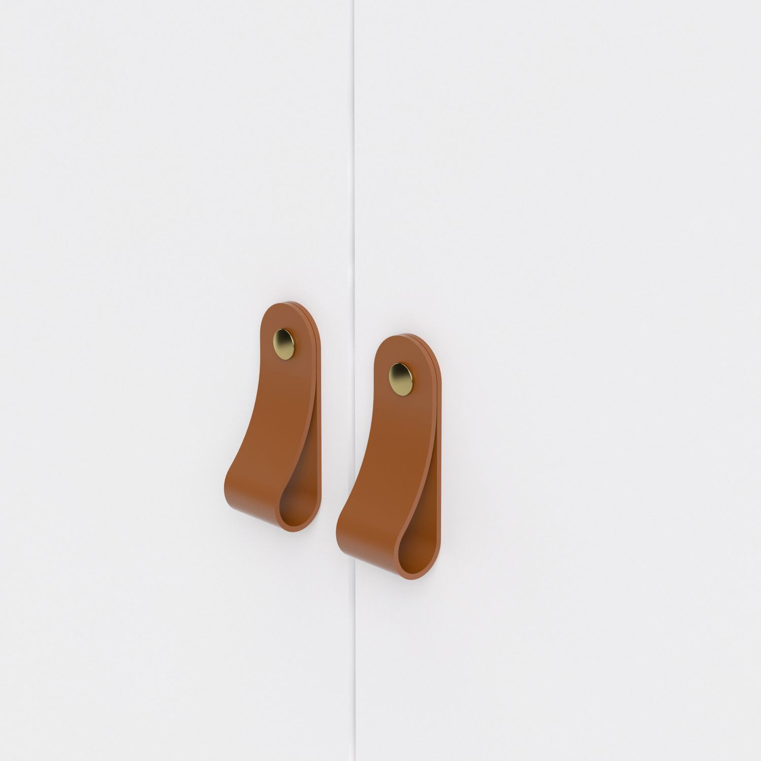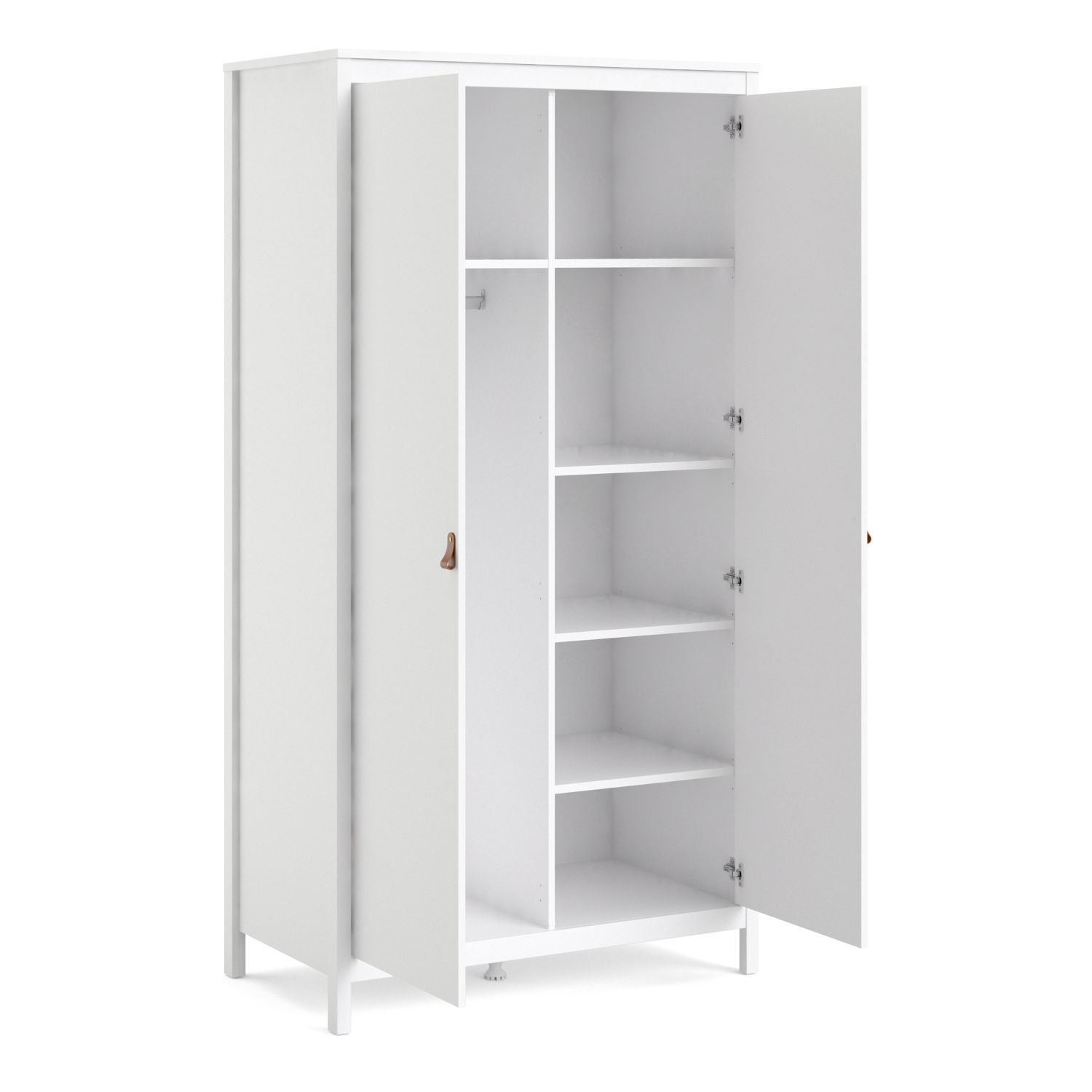 A modern two door wardrobe in a striking design complete with brown leather tab handles, also available in contrasting matt black