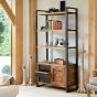 The steel outer frame not only provides structural support but also adds a touch of modern flair to the design. Featuring four shelves, three drawers, and a cupboard, this bookcase offers versatile storage options to suit your needs.