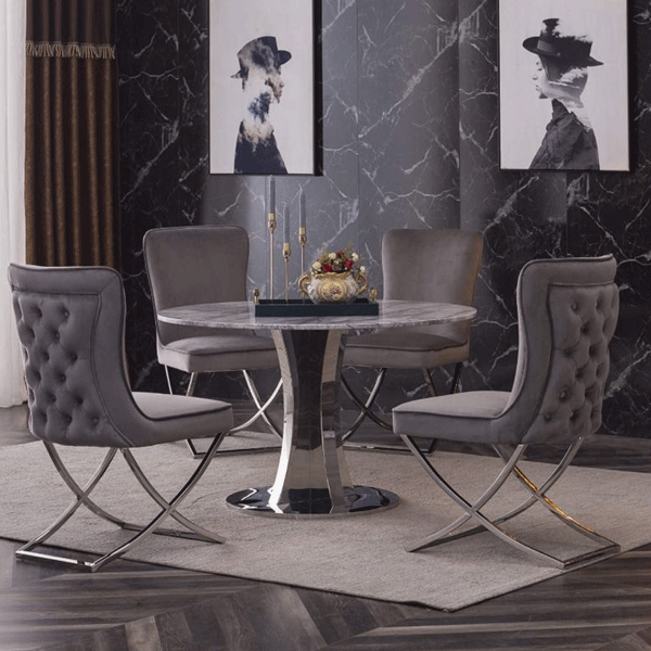 Luxurious Durango Circular Dining Table - Natural Stone Marble Effect Finish with Lacquer and Silver Stainless Steel Base
