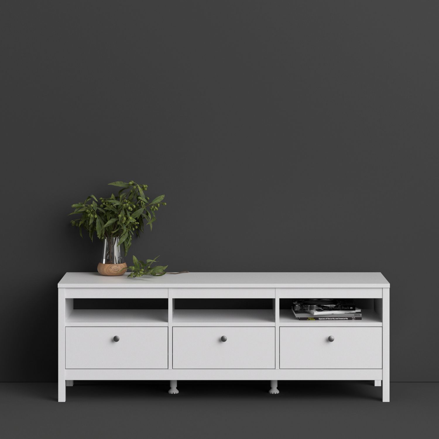 A contemporary tv-unit including 3 drawers for all your storage needs in an elegant design complete with a simple metal handle, also available in contrasting matt black