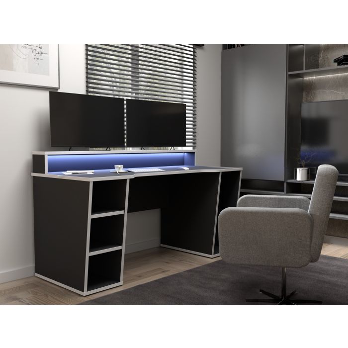 Modern Design Large Gaming Desk with LED, Shelf - Matt Black