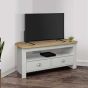 Inspired by classic farmhouse furniture the Highgate range has been designed to complement both modern and traditional homes. The Highgate range is modern, practical, affordable furniture and with stylish silver handles looks fantastic too. Available in cream & oak, grey & oak and navy & oak this range will suite a wide array of interiors. A beautiful addition to any room in your home, this Highgate Corner TV Unit is the perfect TV stand. Featuring a large shelf for entertainment units as well as 2 large storage drawers which are finished off with silver handles. The maximum recommended size of TV to be used is 43''. Care instructions: Wipe carefully with a soft, dry cloth.