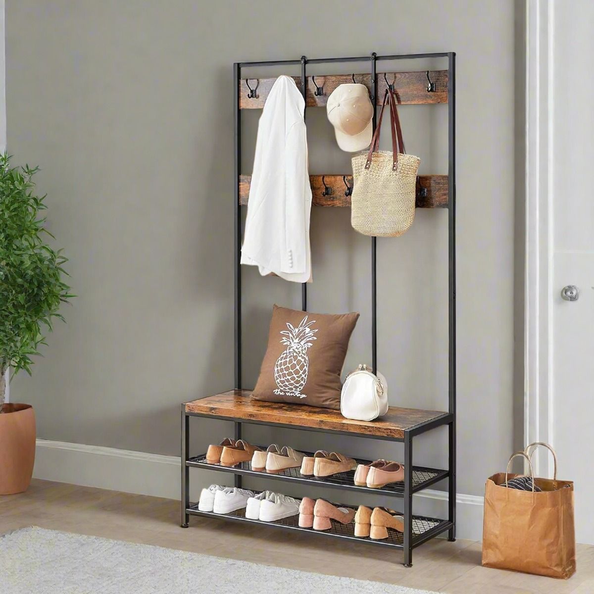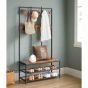 MORVANE Coat Rack Entryway Stand with 12 Hooks and Bench - Rustic Brown and Black