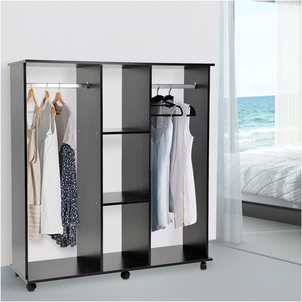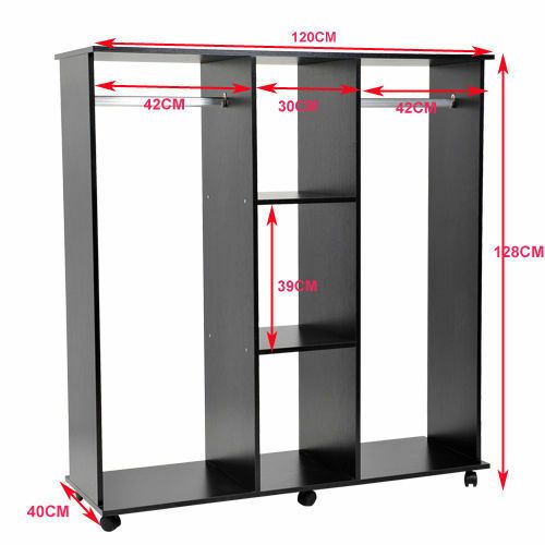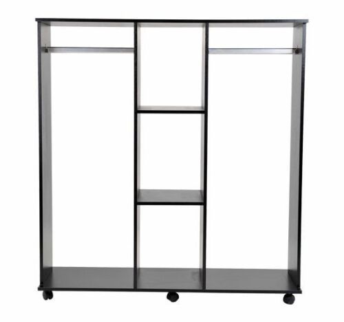 Movable Double Open Wardrobe With 2 Hanging Rails And 3 Tier Cubes Storage - Black