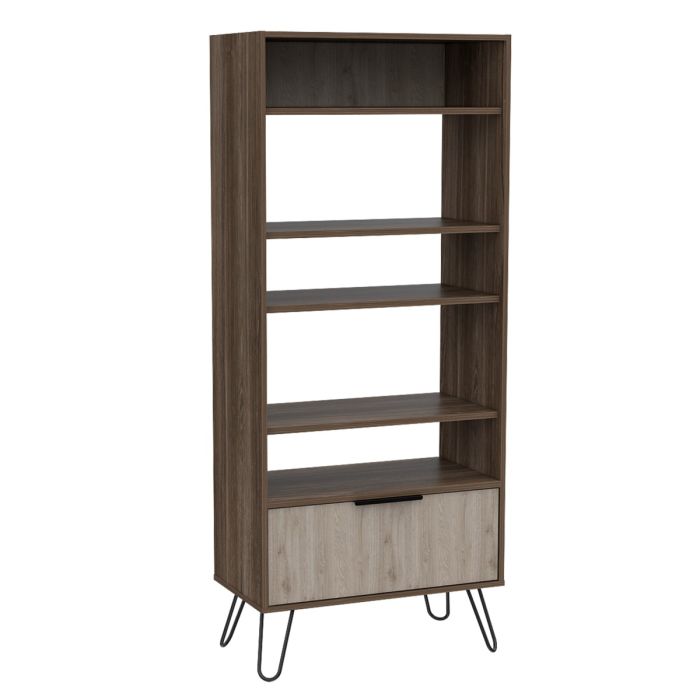 This display bookcase features and abundance of shelving space plus a handy enclosed storage area behind a drop down door. Made in a smoked Oak effect with contrasting bleached grey oak finish with black pull handles and hairpin shape legs.